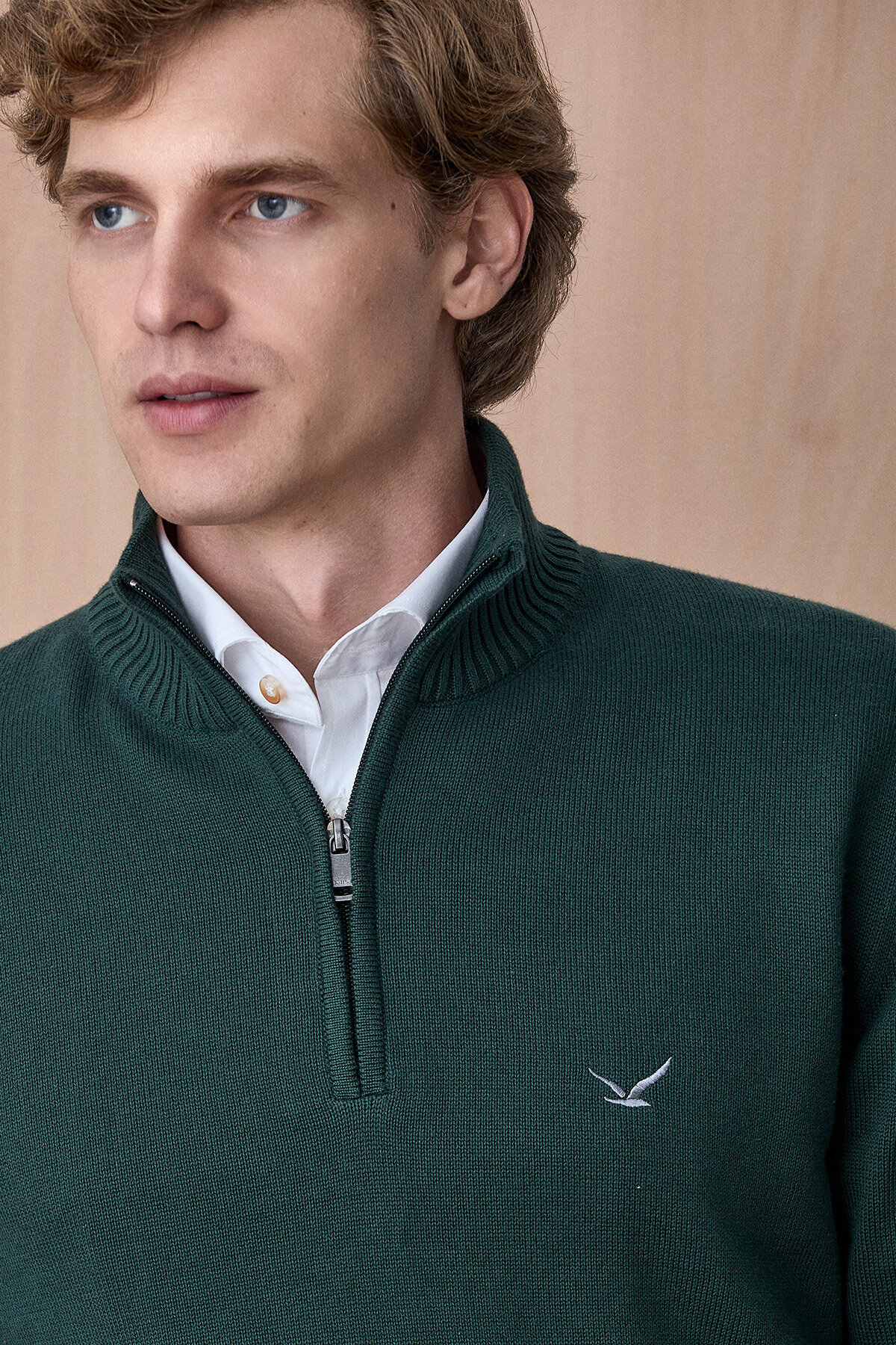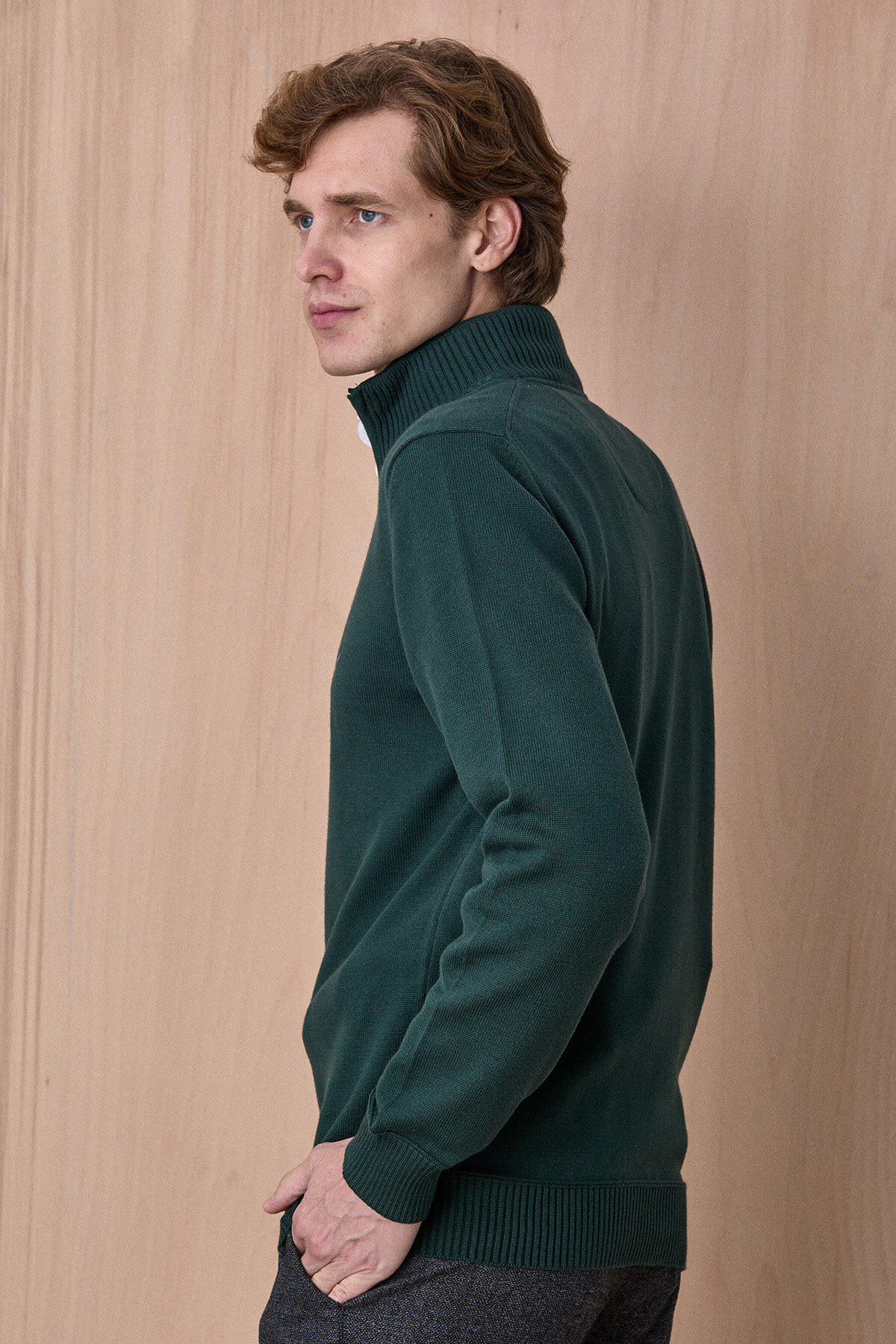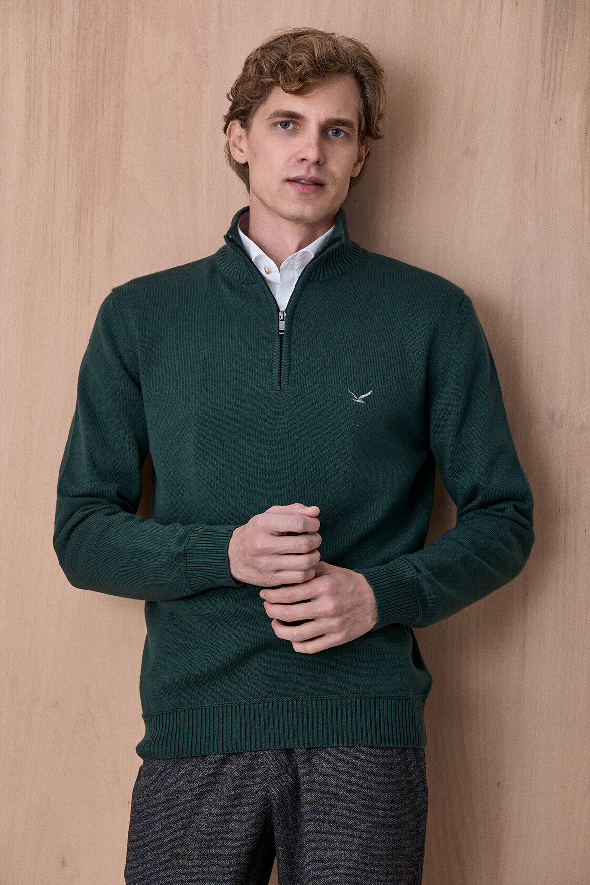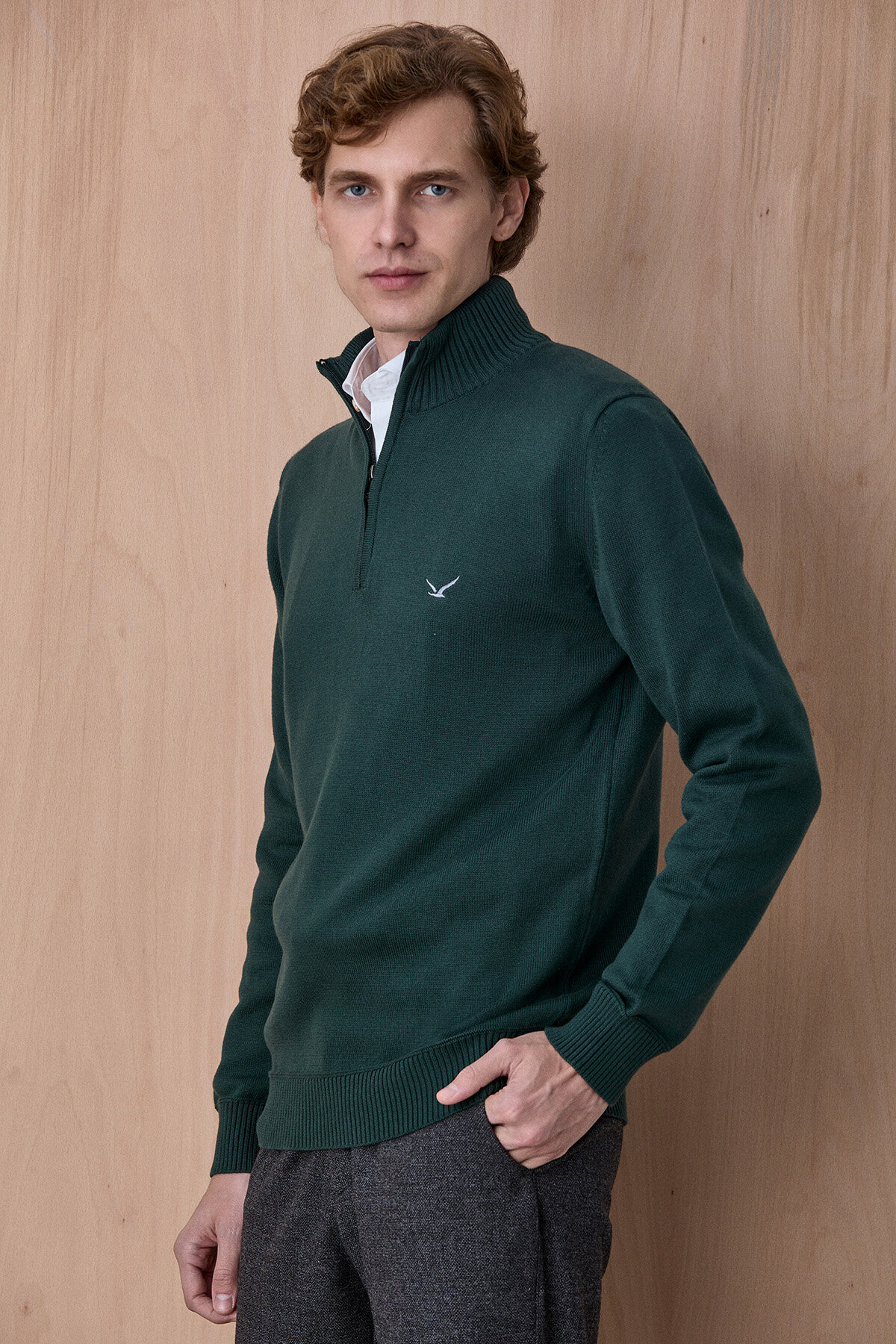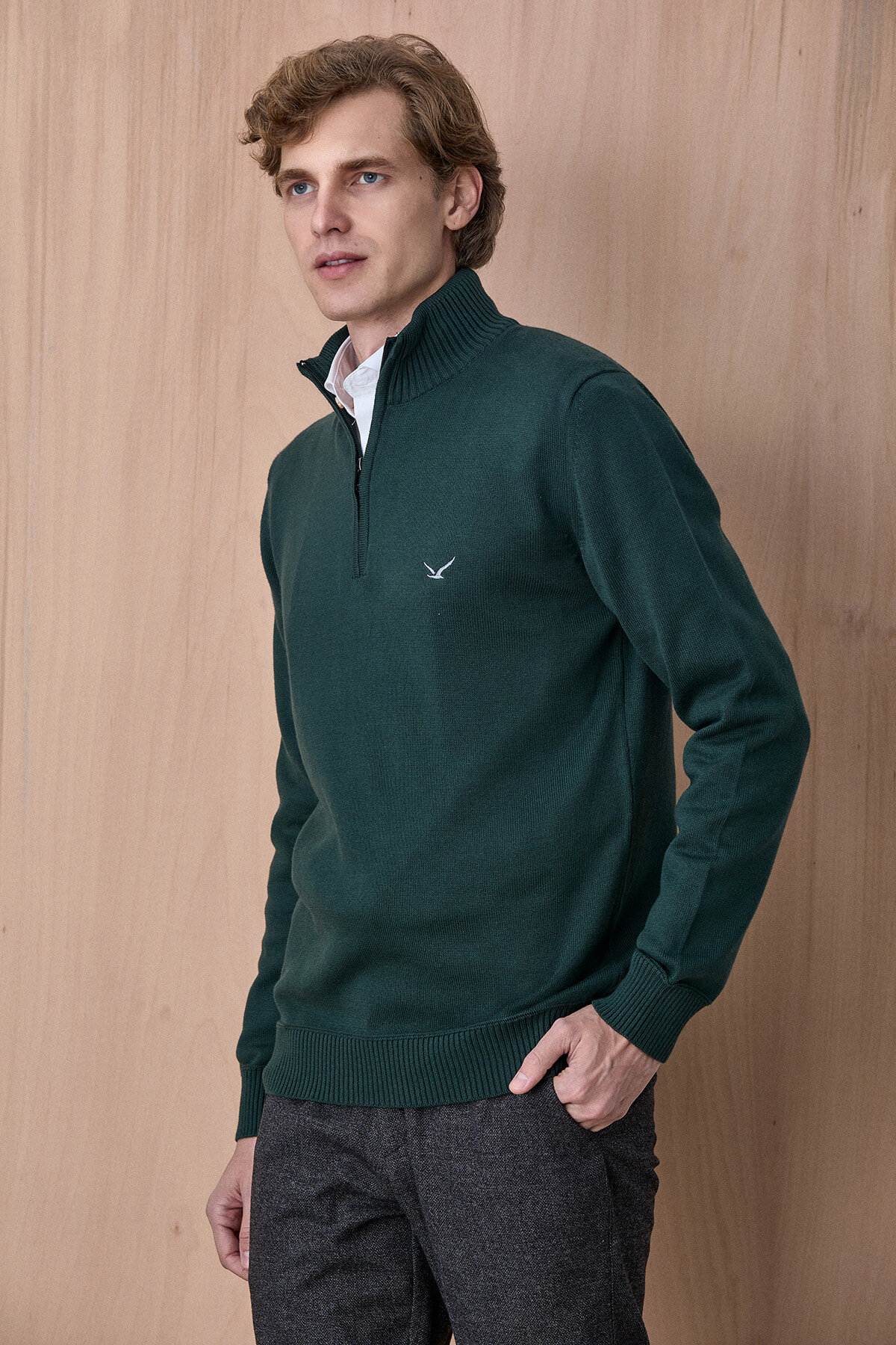 Koyu Yeşil %100 Pamuk Fermuarlı Kazak