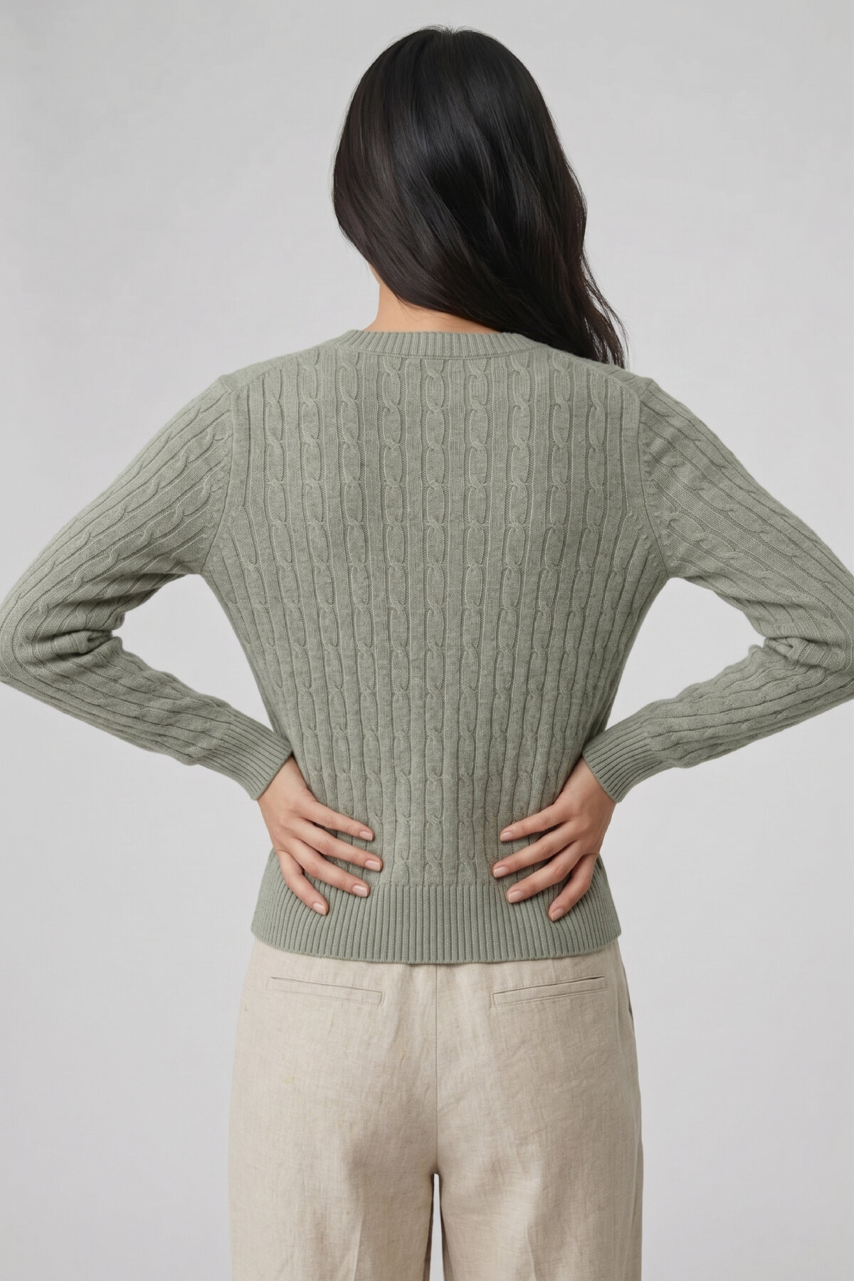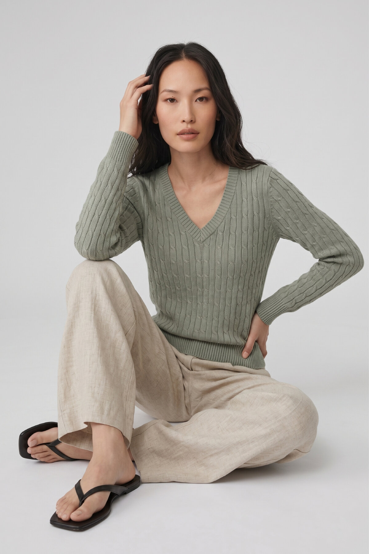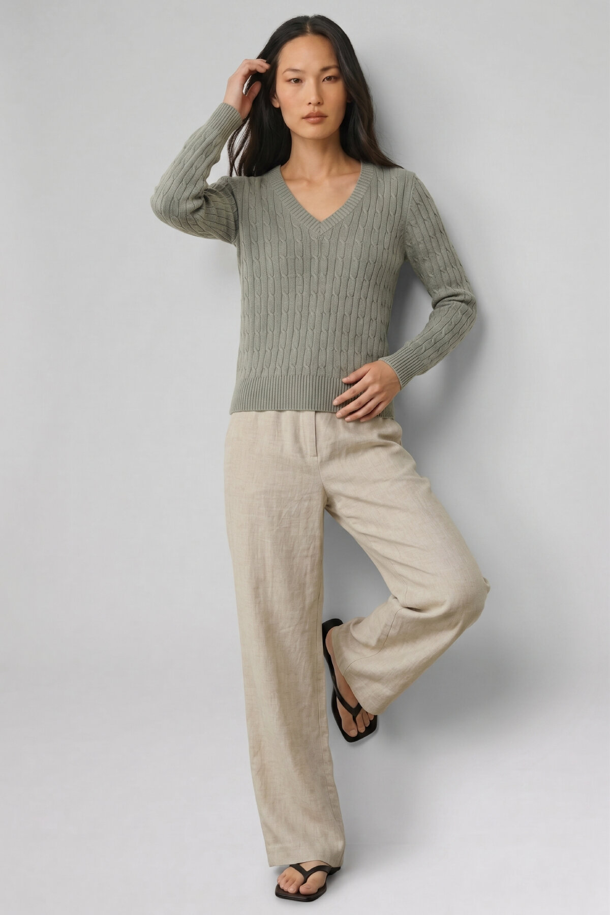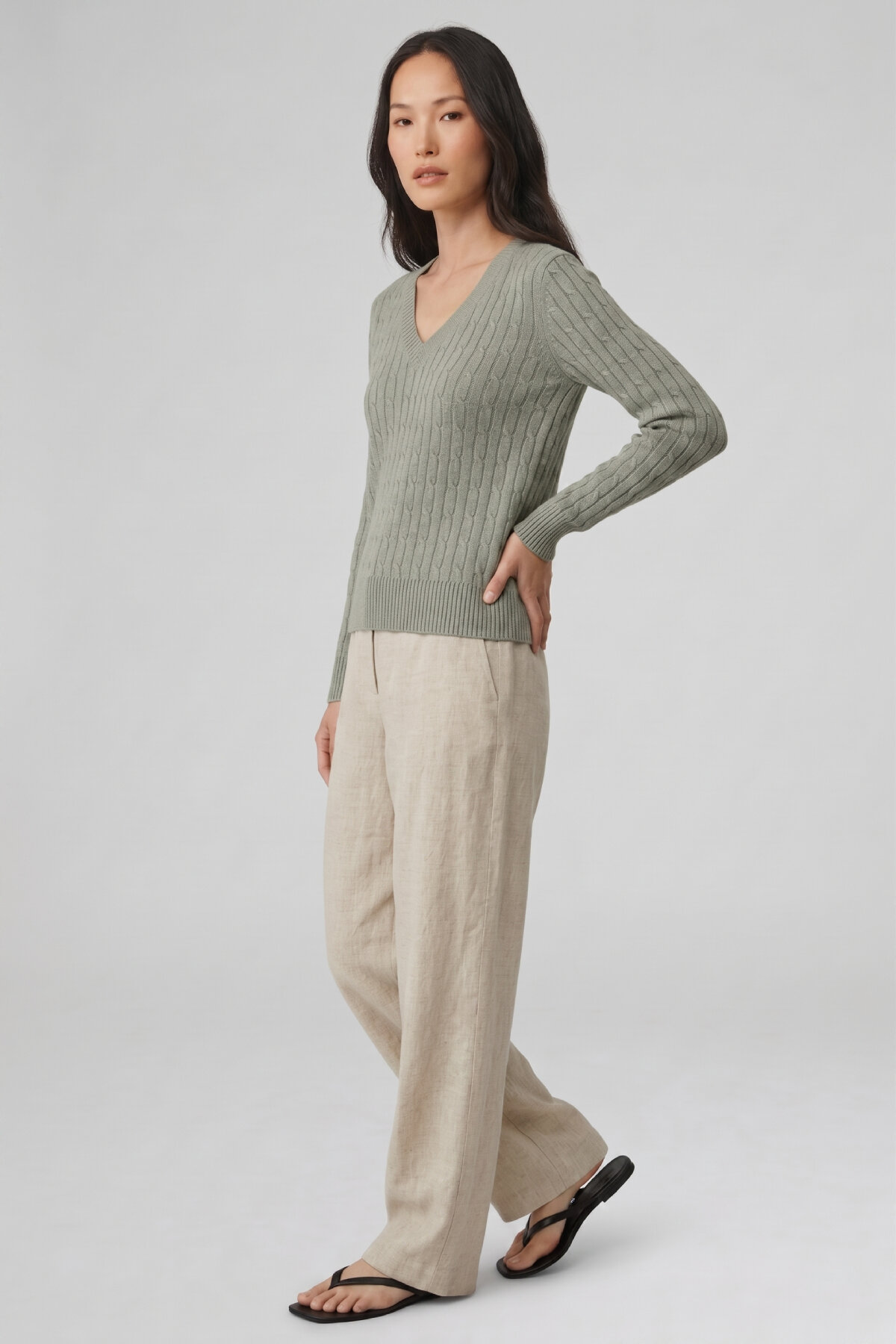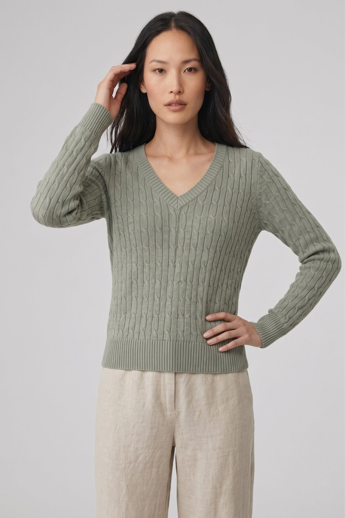 Açık Haki %100 Pamuk V Yaka Triko Kazak
