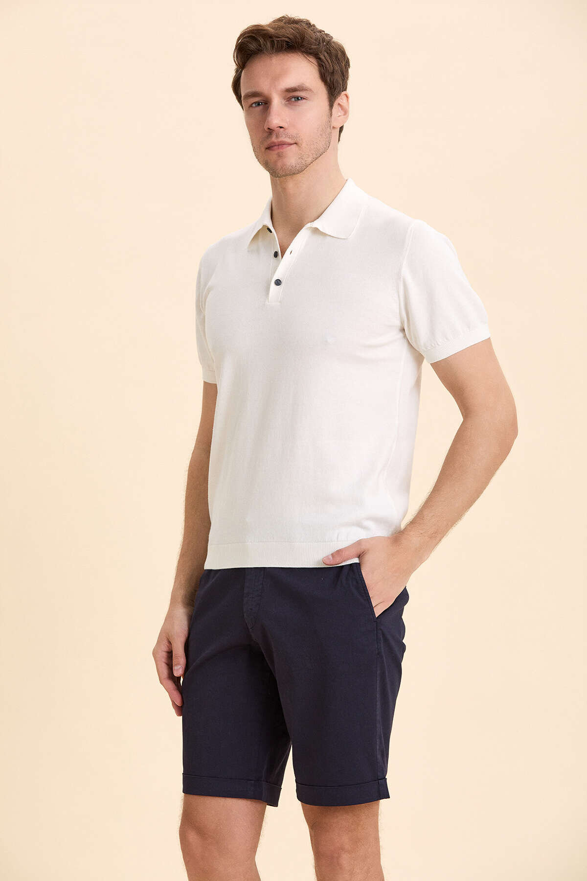 Reflect the power of minimalism in your style! This stylish polo neck knitwear made of extra fine cotton will be the most preferred piece of your wardrobe with its elegant and simple lines. While it provides comfort all day long with its soft textured fabric, it adds a modern interpretation to your classic style with its contrast button details.