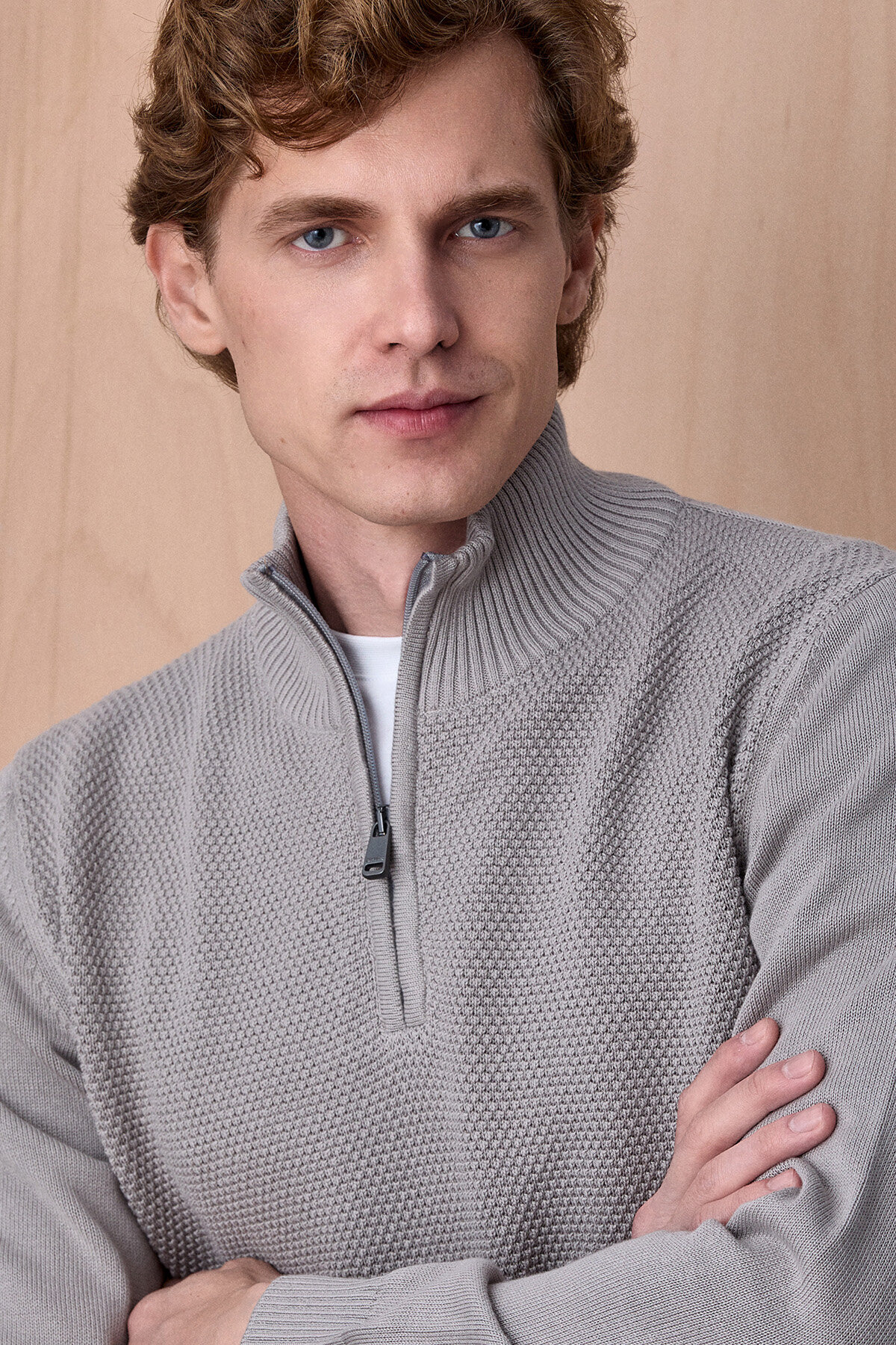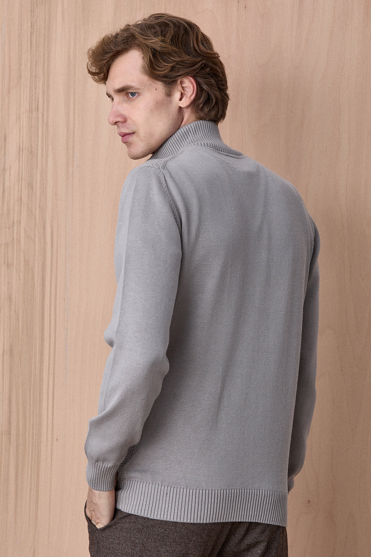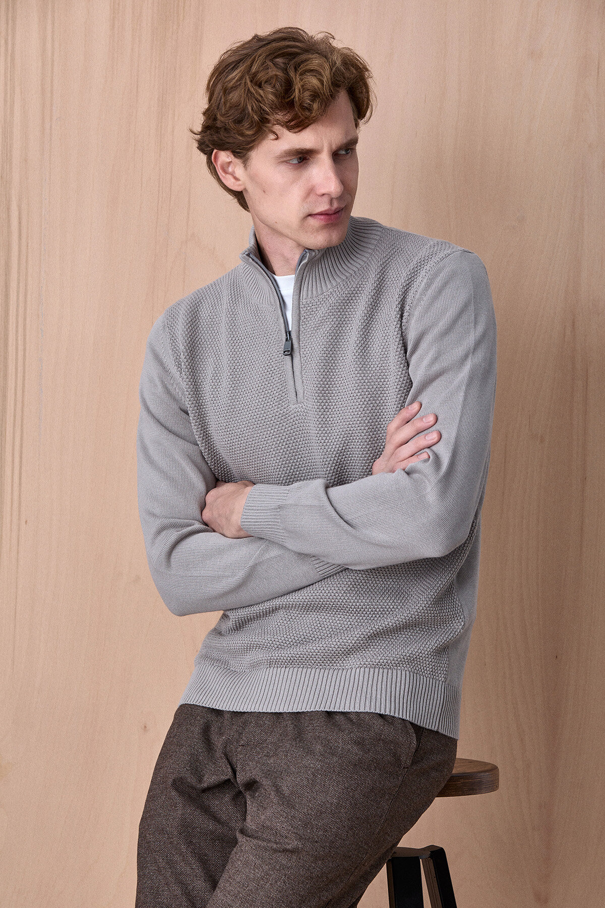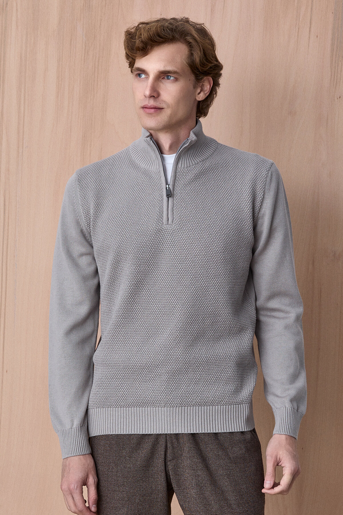 Taş Rengi %100 Pamuk Fermuarlı Kazak