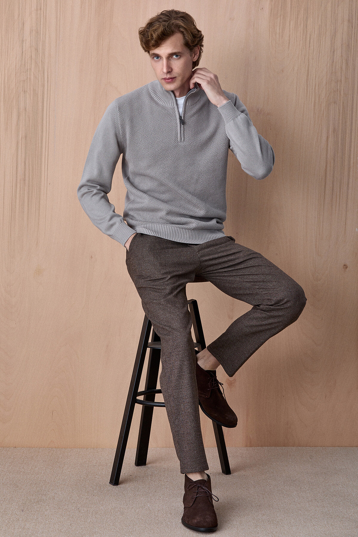 Arasvik Taş Rengi %100 Pamuk Yarım Fermuarlı Triko Kazak, klasik triko dokusunu modern ve rahat bir tasarımla buluşturan zamansız bir parçadır. %100 pamuklu yapısı sayesinde gün boyu konfor sağlarken, yarım fermuarlı yaka detayı hem fonksiyonel hem de şık bir görünüm sunar. Dokulu triko yüzeyi ürüne karakter kazandırırken, gömleklerle birlikte katmanlı kombinlerde de rahatlıkla kullanılabilecek dengeli ve stil sahibi bir tasarım oluşturur.