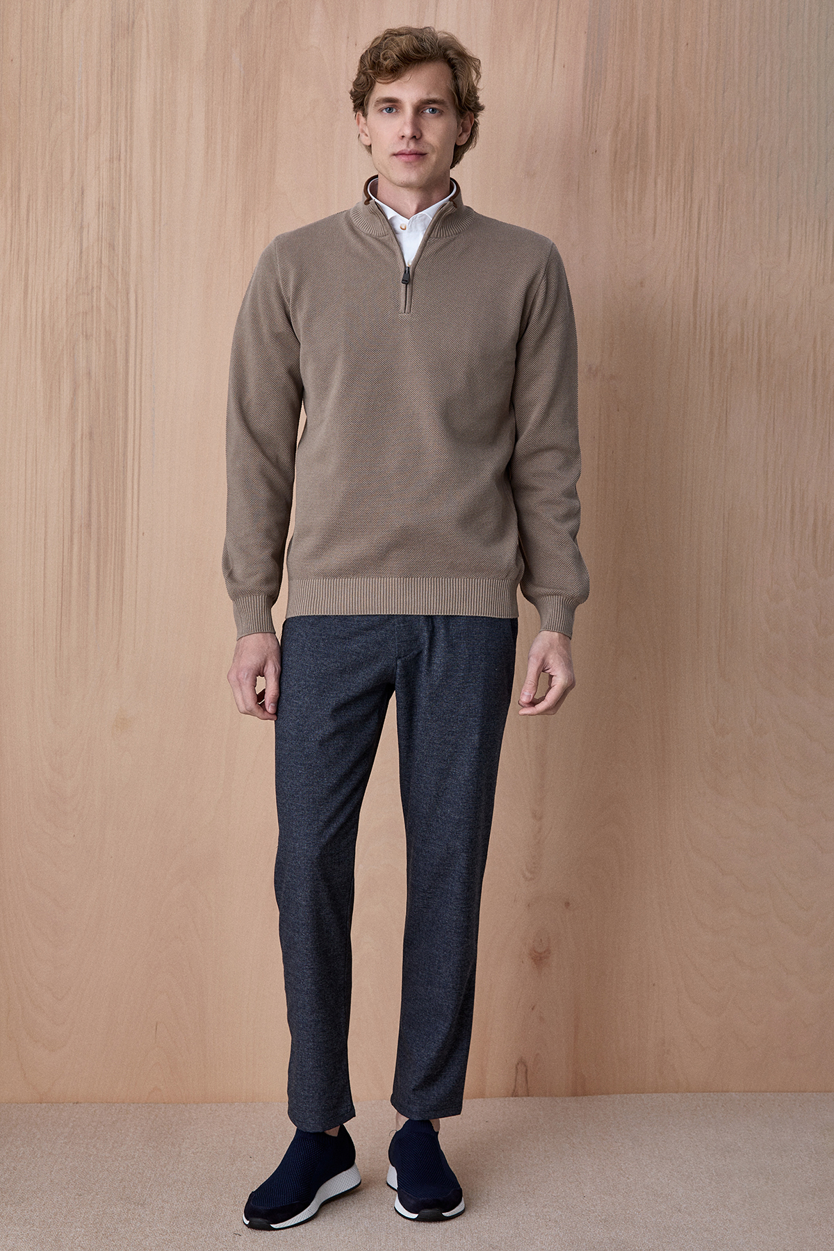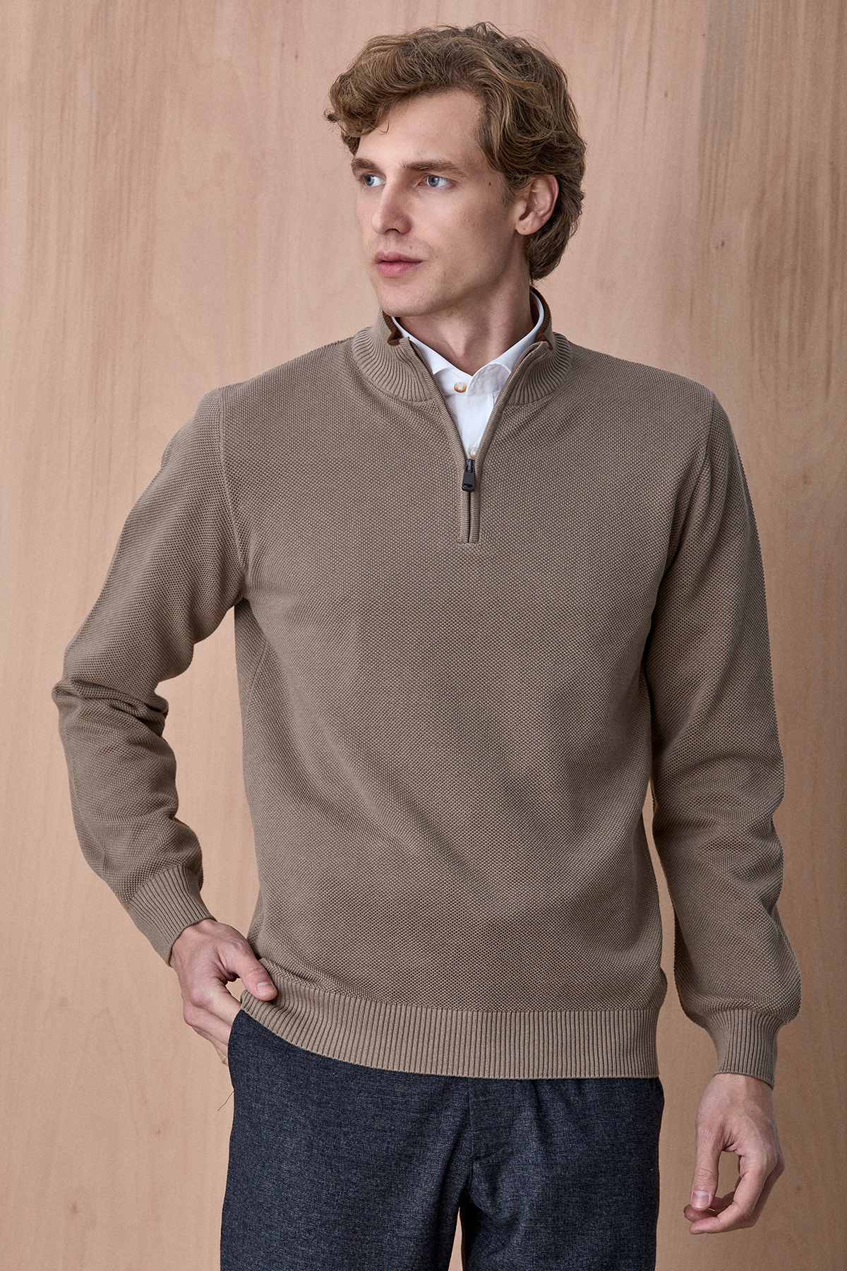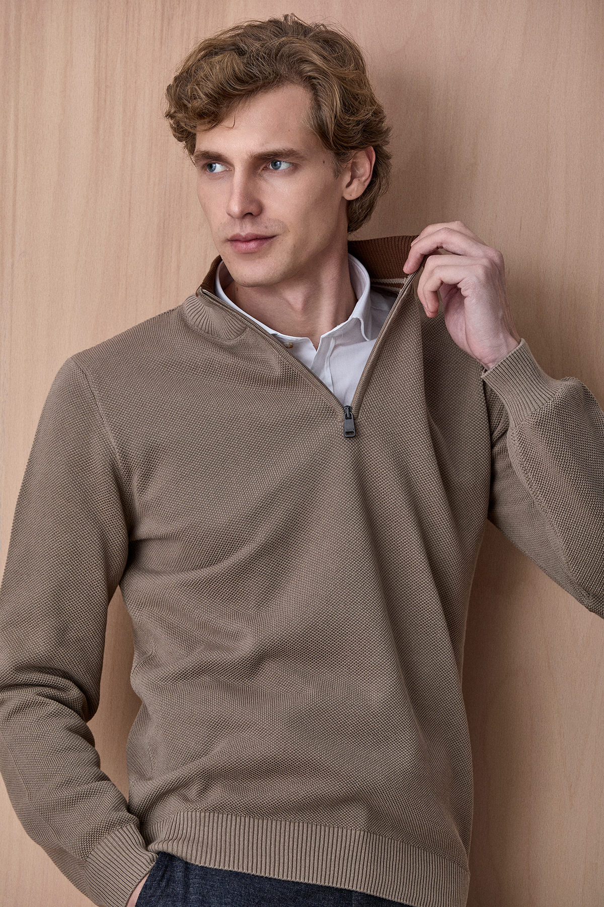 Badder Bej %100 Pamuk Fermuarlı Triko