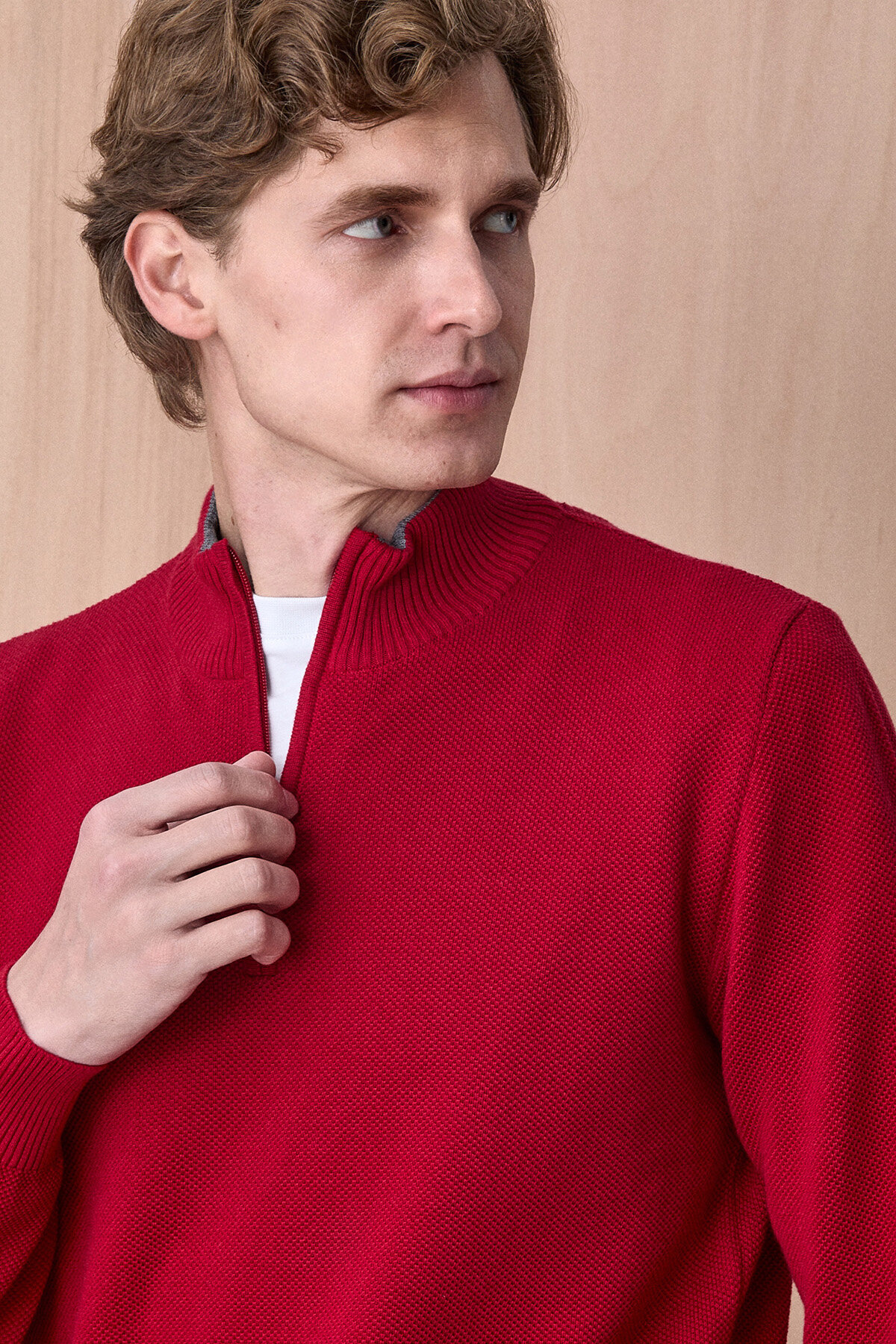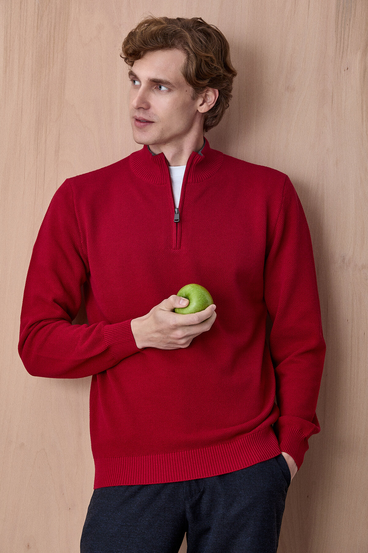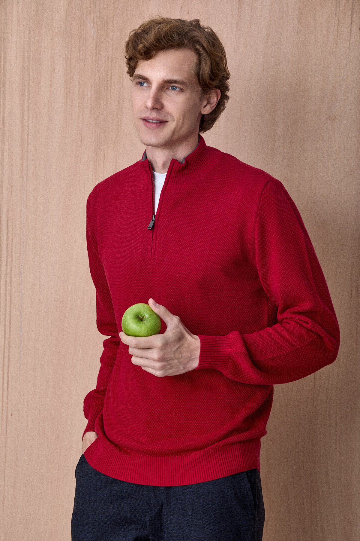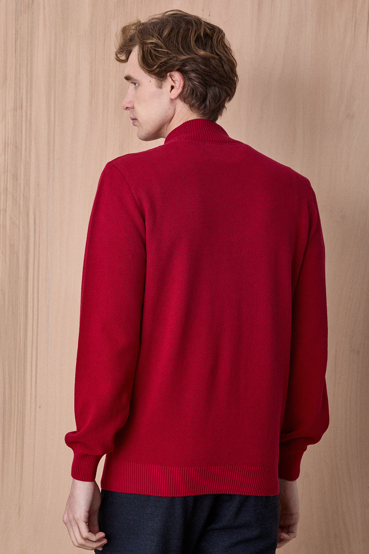 Kırmızı %100 Pamuk Fermuarlı Kazak