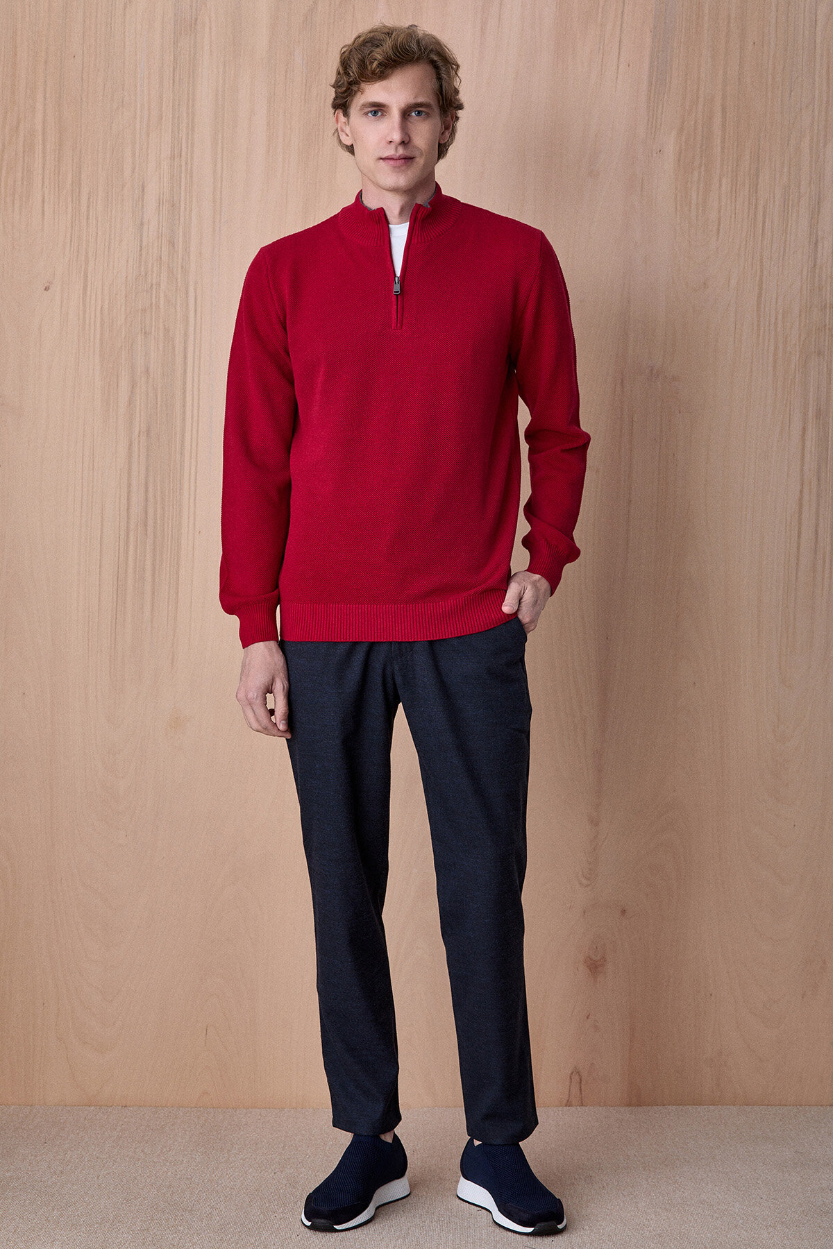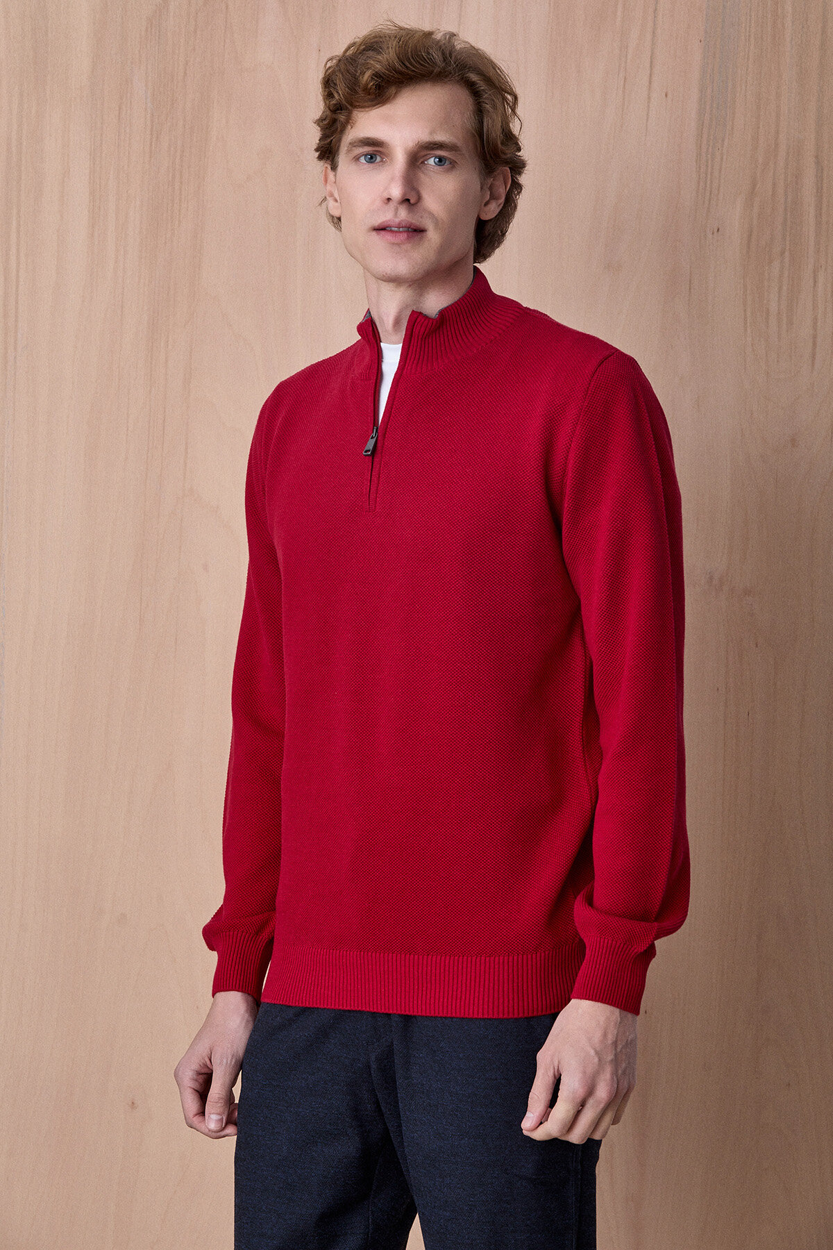 Badder Kırmızı %100 Pamuk Yarım Fermuarlı Triko Kazak, modern dokusu ve sade tasarımıyla günlük stil için zamansız bir seçenek sunar. %100 pamuklu yapısı sayesinde gün boyu konfor ve nefes alabilirlik sağlarken, yarım fermuarlı yaka detayı ürüne sportif ve fonksiyonel bir karakter kazandırır. Melanj triko dokusu tasarıma derinlik katarken, hem casual hem de smart casual kombinlerde rahatlıkla kullanılabilecek şık bir tamamlayıcıdır.