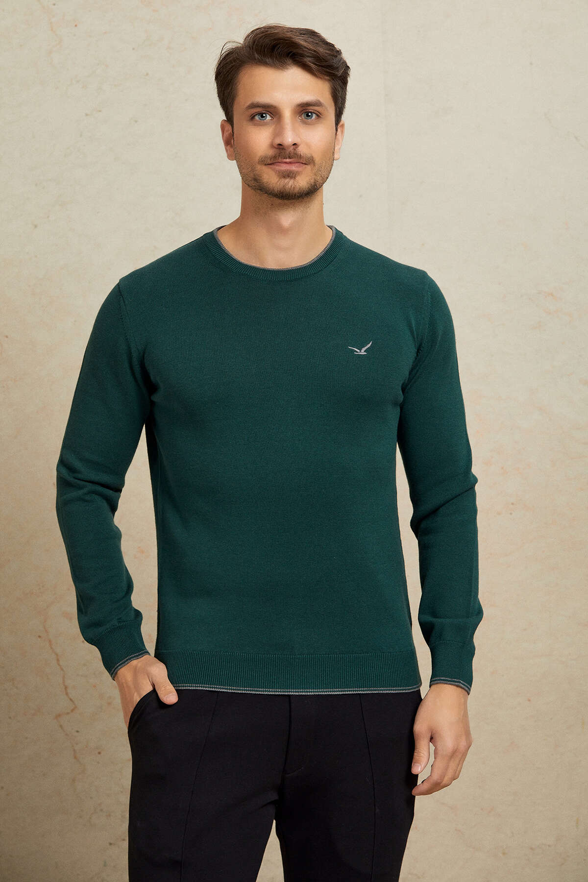 Koyu Yeşil %100 Pamuk Yuvarlak Yaka Kazak