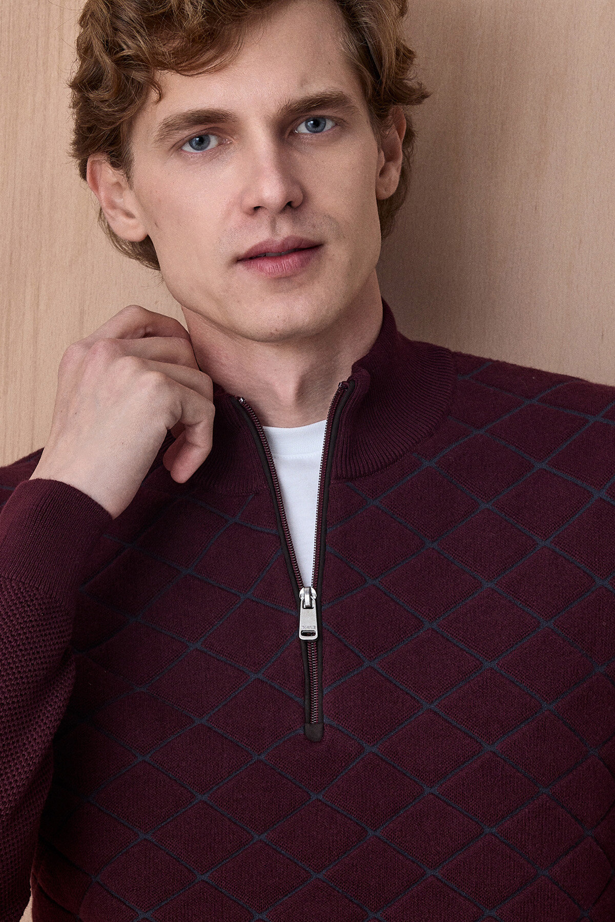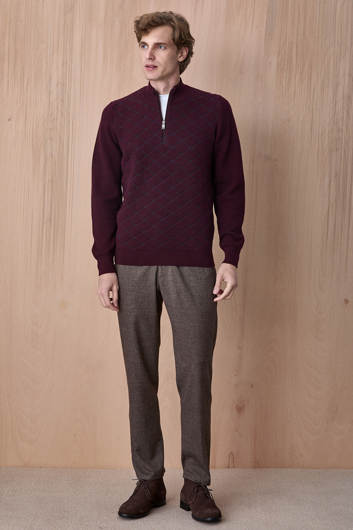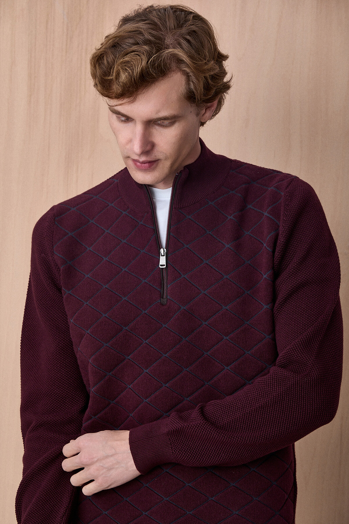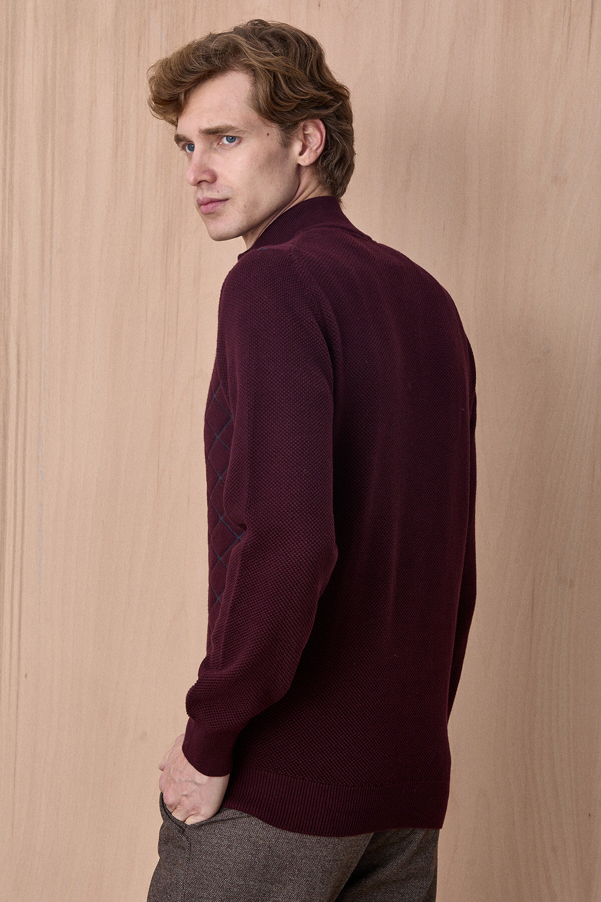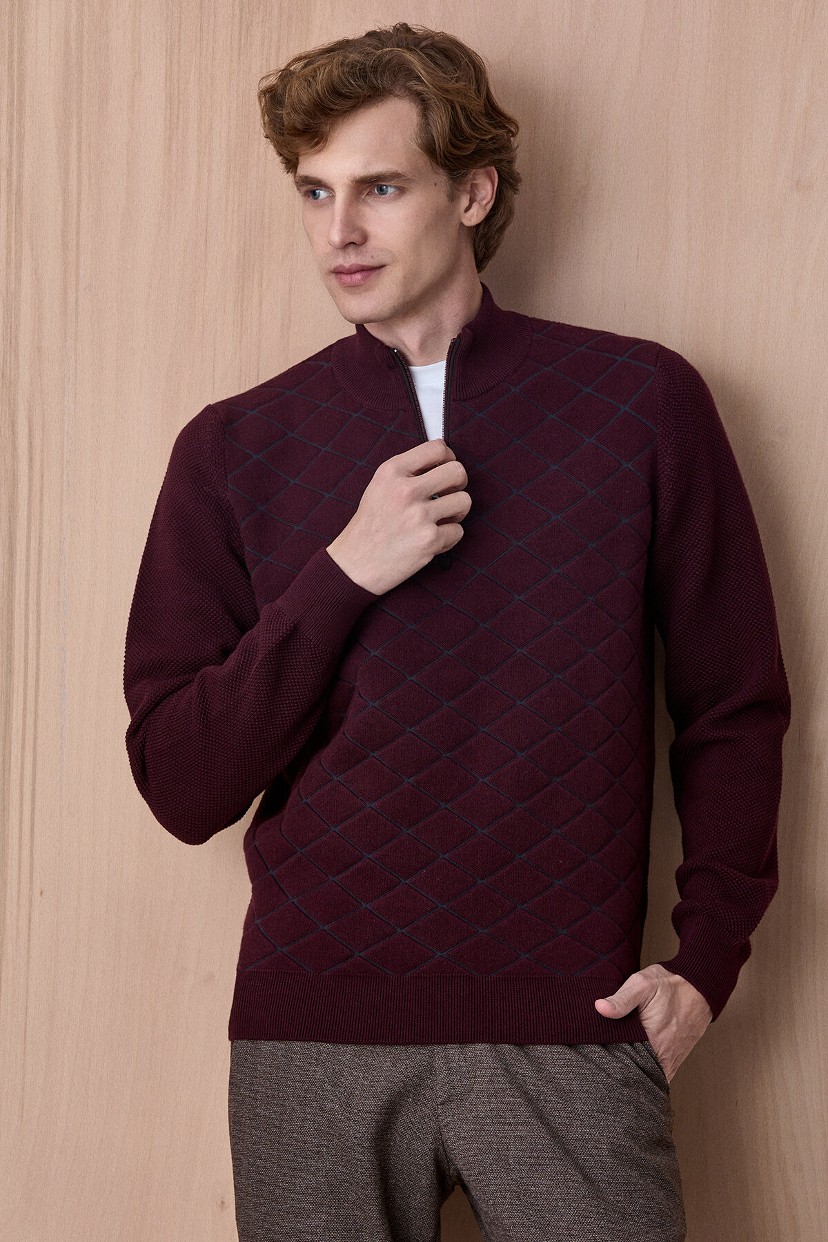 Bordo Pamuklu Kısa Fermuarlı Kazak