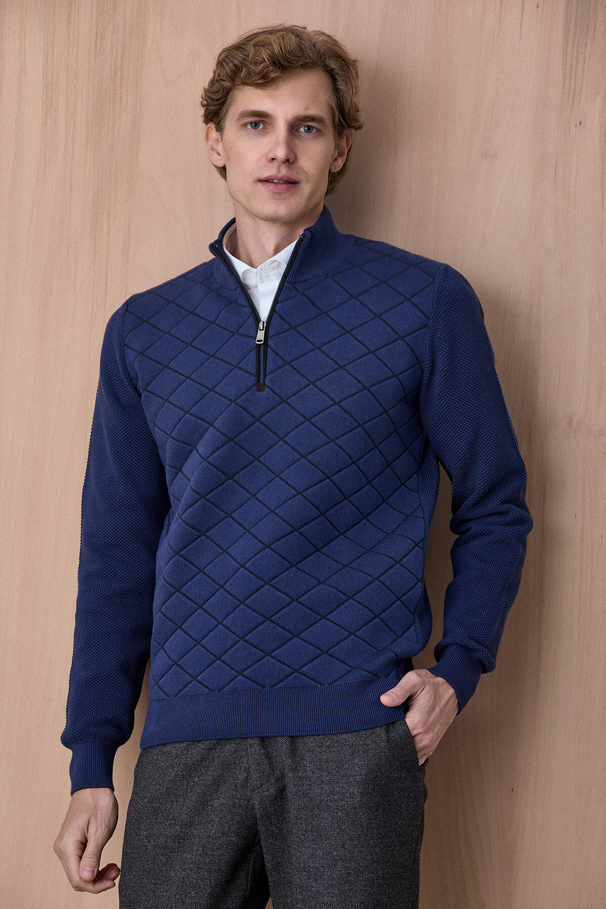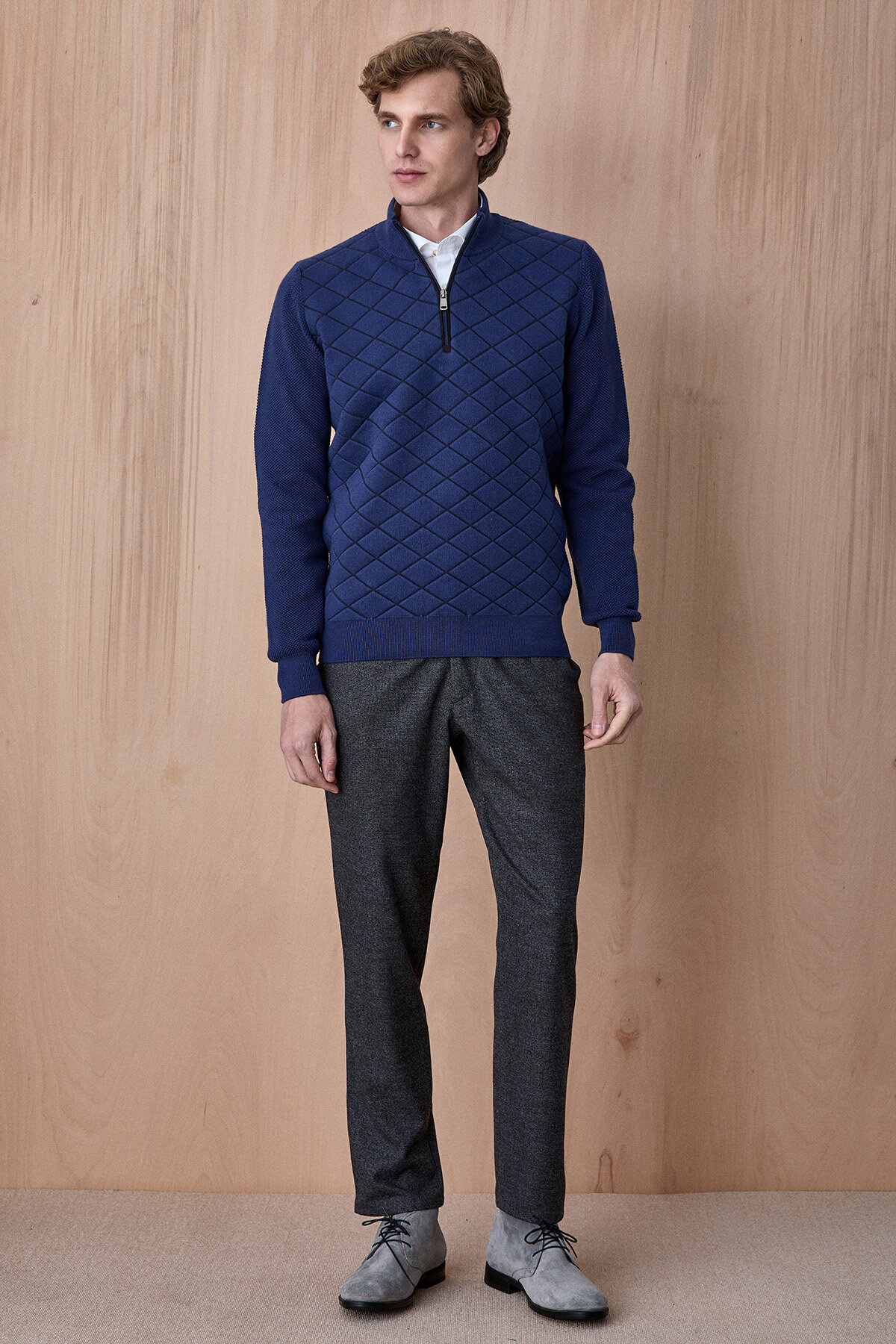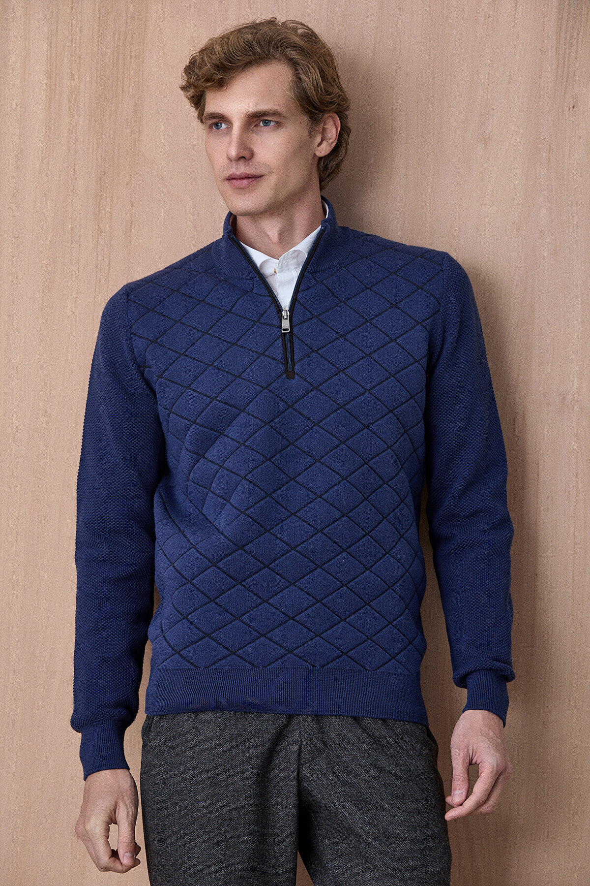 Borger Indigo Pamuk Karışımlı Yarım Fermuarlı Triko Kazak, modern dokulu tasarımı ve konforlu yapısıyla günlük stilin şık tamamlayıcılarından biridir. Pamuk ağırlıklı triko dokusu sayesinde nefes alabilen ve yumuşak bir kullanım sunarken, yarım fermuarlı yaka detayı ürüne modern ve sportif bir karakter kazandırır. Ön yüzeydeki geometrik dokulu örgü detayı tasarıma derinlik katarken, hem casual hem de smart casual kombinlerde rahatlıkla kullanılabilecek zamansız bir parçadır.