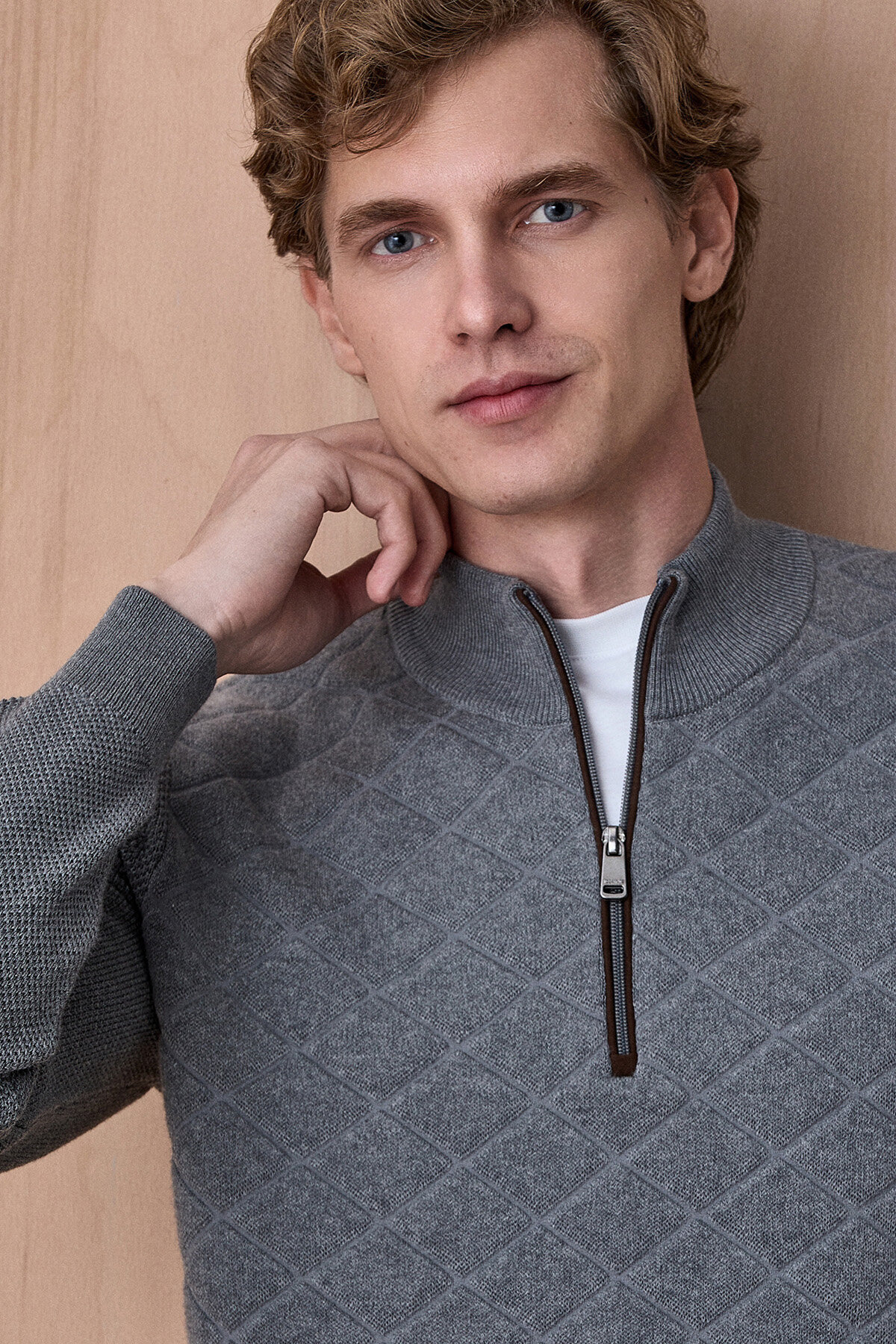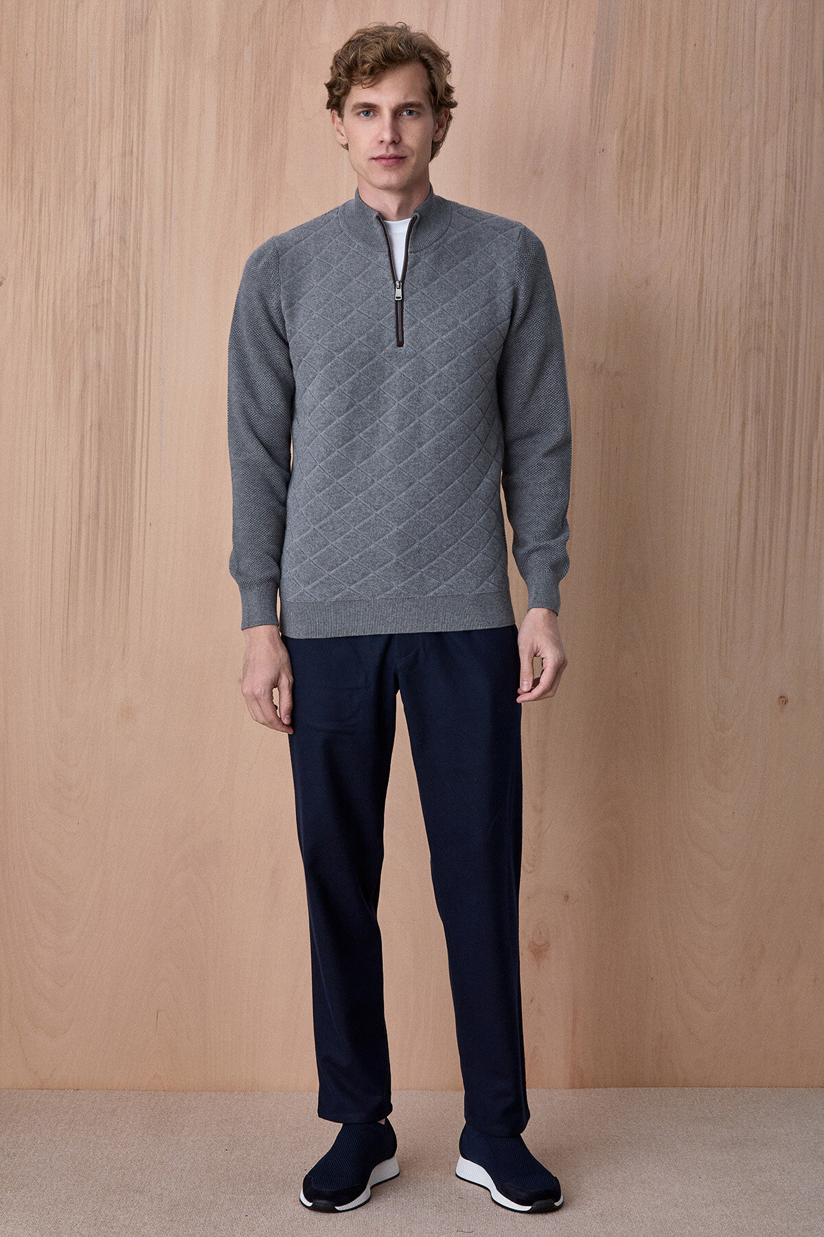- • Modern görünüm sunan yarım fermuarlı yaka tasarım