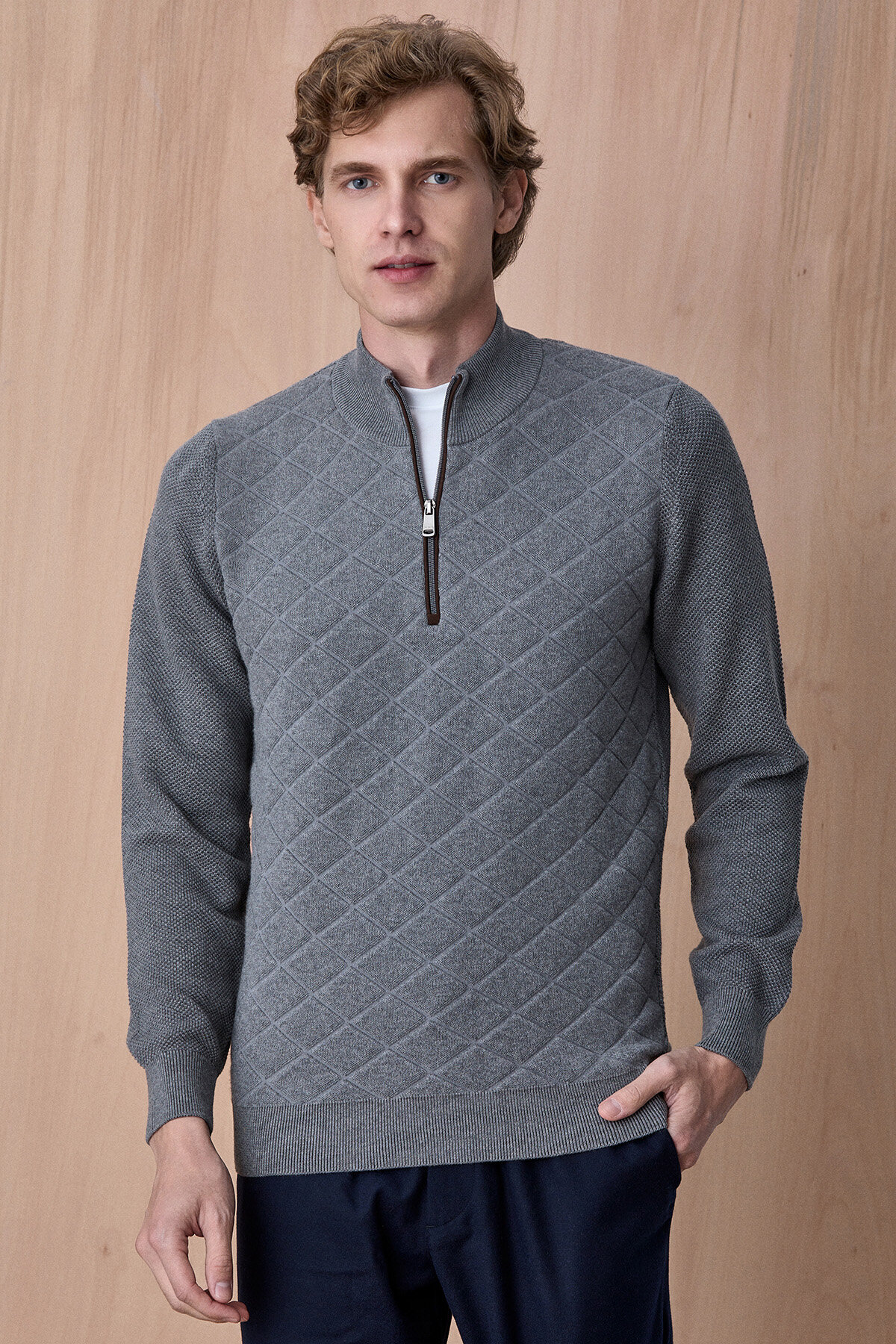 Borger Koyu Gri Pamuk Karışımlı Yarım Fermuarlı Triko Kazak, modern dokulu tasarımı ve konforlu yapısıyla günlük stilin şık tamamlayıcılarından biridir. Pamuk ağırlıklı triko dokusu sayesinde nefes alabilen ve yumuşak bir kullanım sunarken, yarım fermuarlı yaka detayı ürüne modern ve sportif bir karakter kazandırır. Ön yüzeydeki geometrik dokulu örgü detayı tasarıma derinlik katarken, hem casual hem de smart casual kombinlerde rahatlıkla kullanılabilecek zamansız bir parçadır.