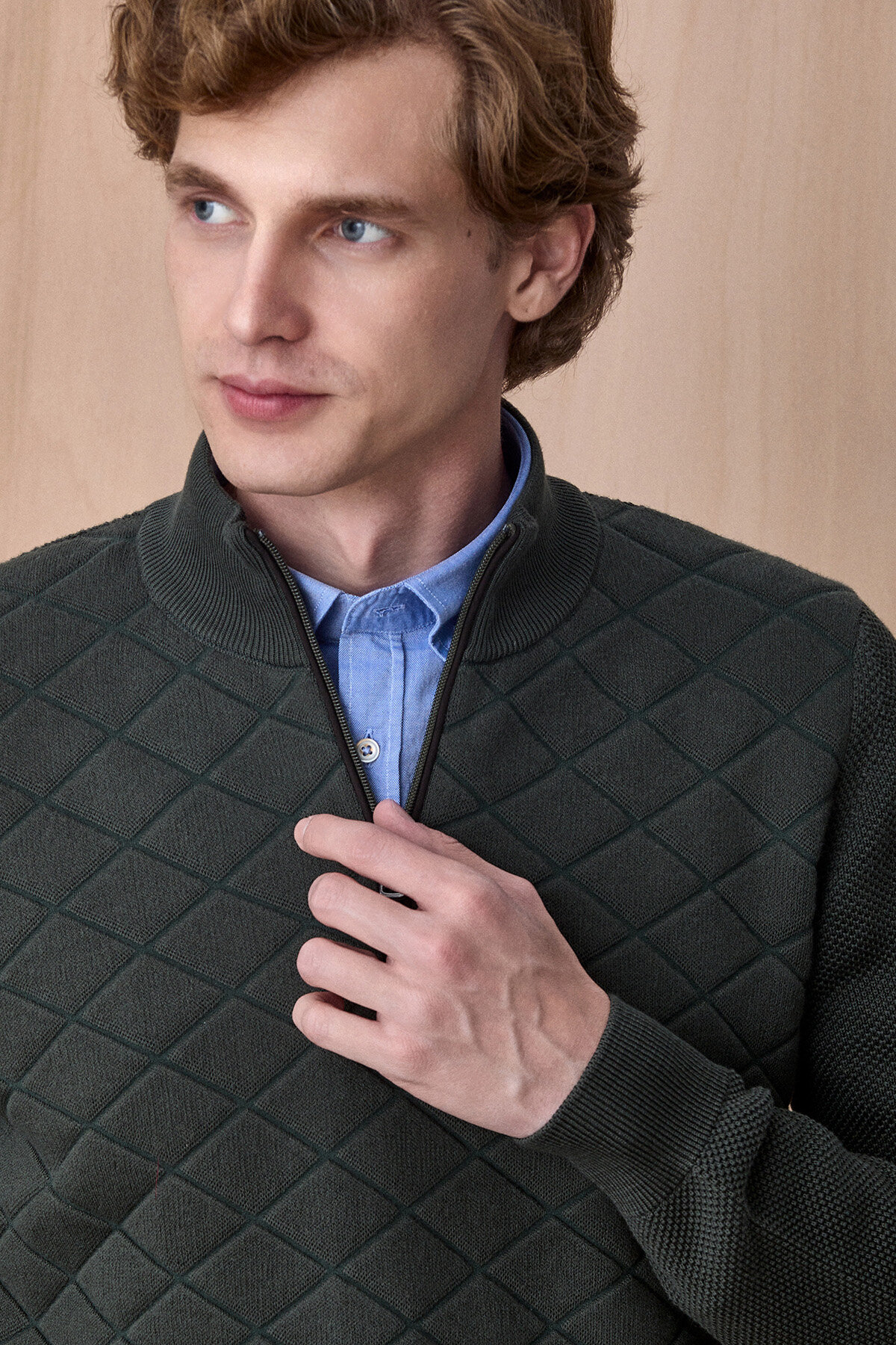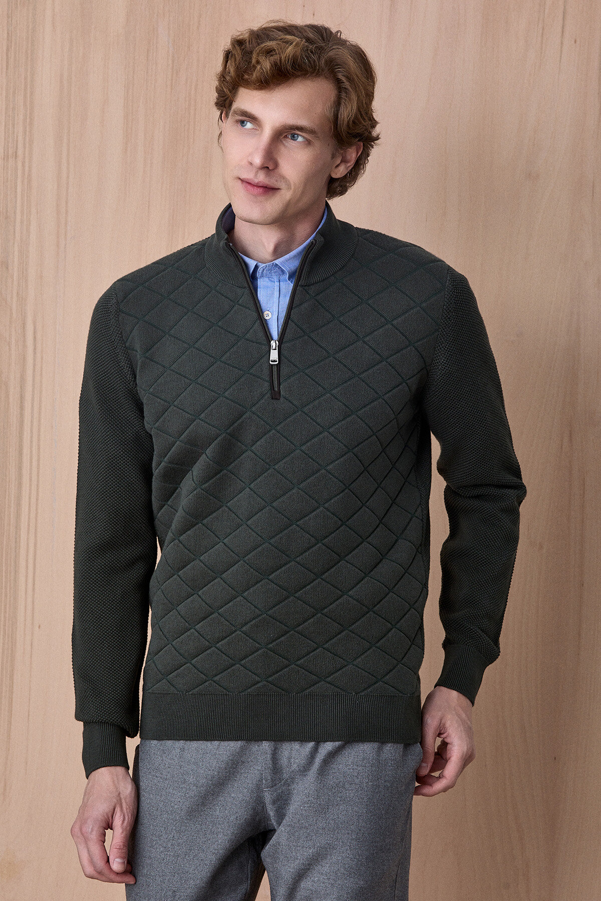 Koyu Yeşil Pamuklu Kısa Fermuarlı Kazak