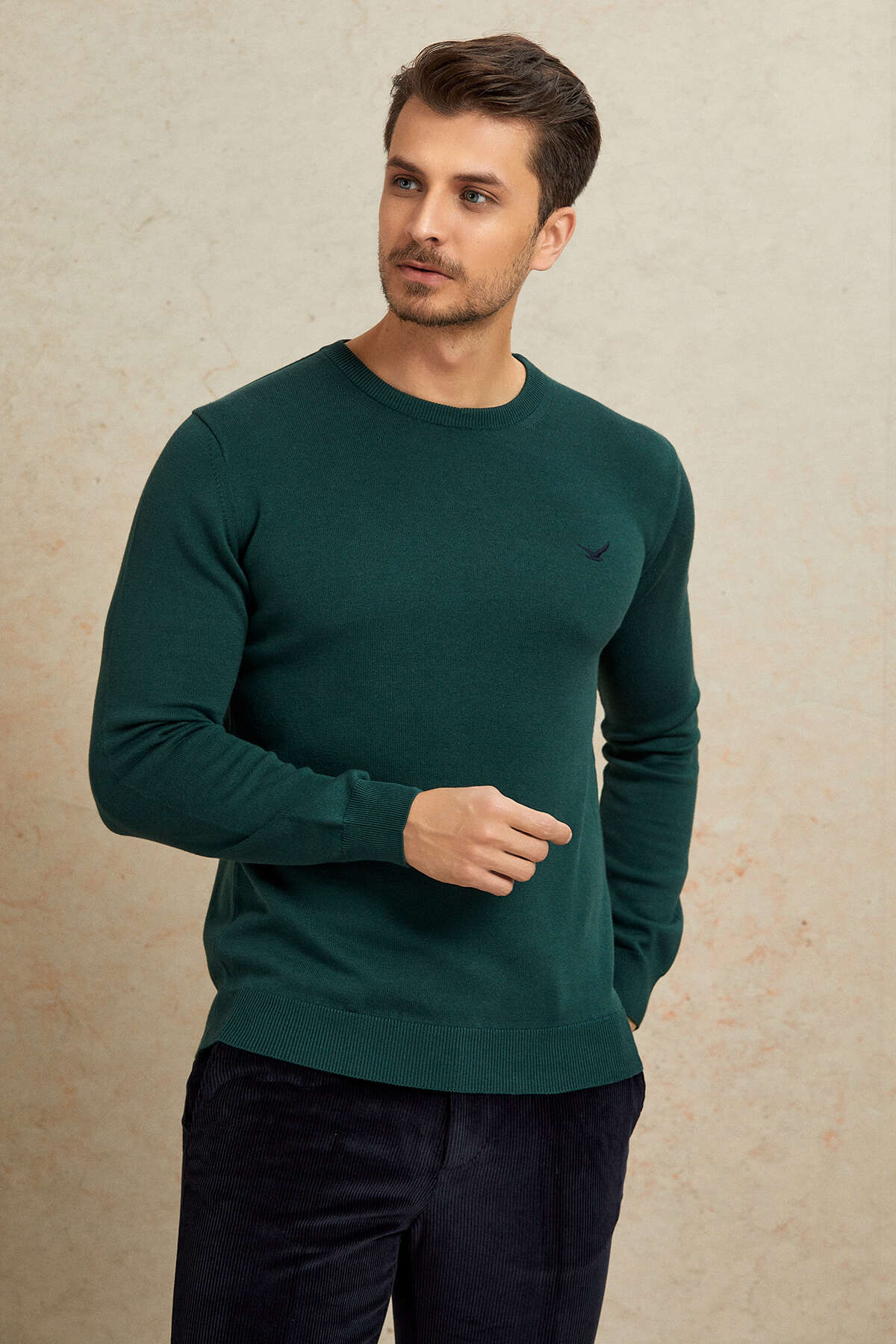 Koyu Yeşil %100 Pamuk Yuvarlak Yaka Kazak
