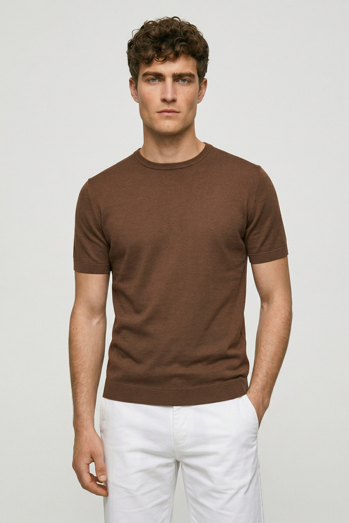Kahverengi %100 Pamuk Bisiklet Yaka Triko Tişört