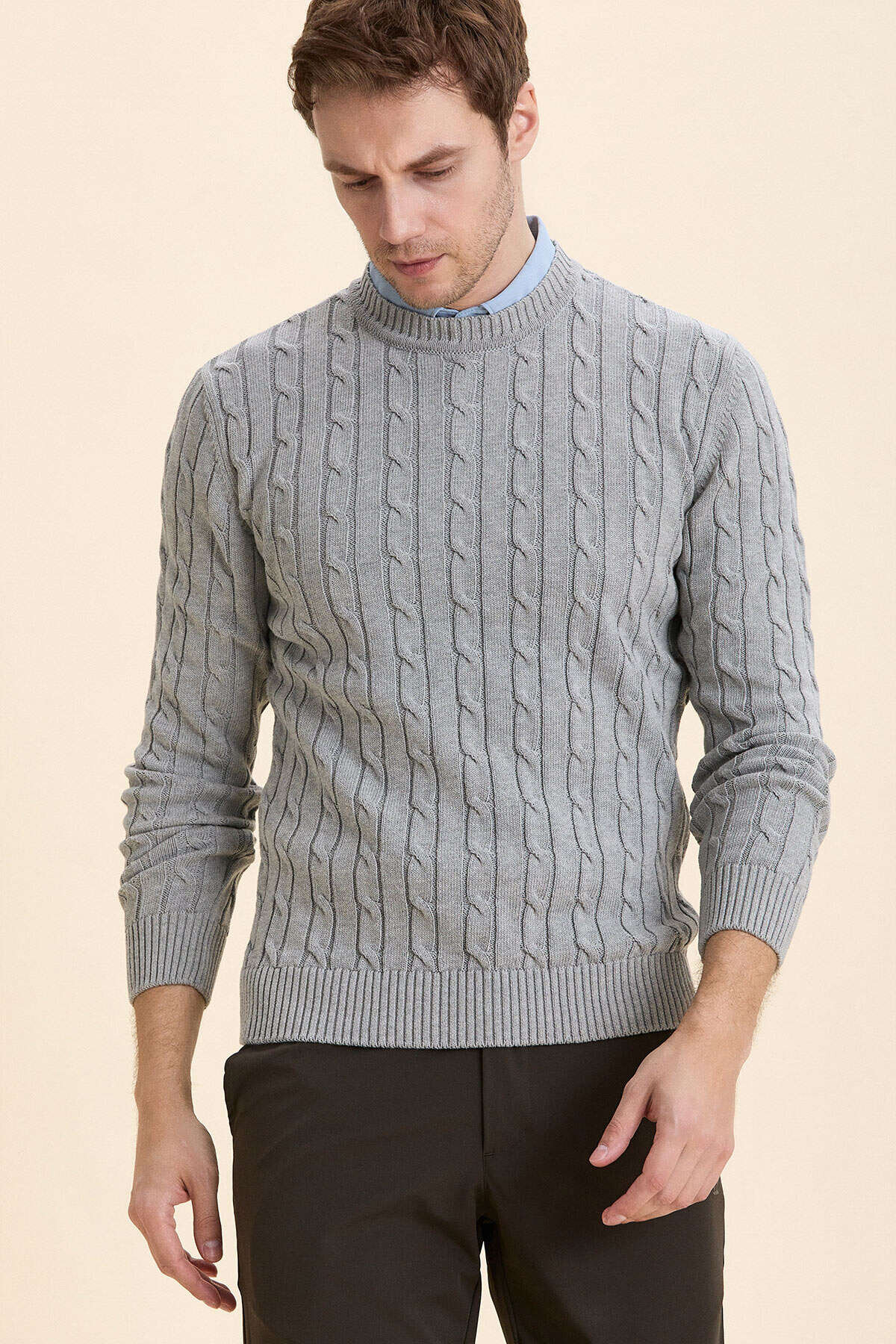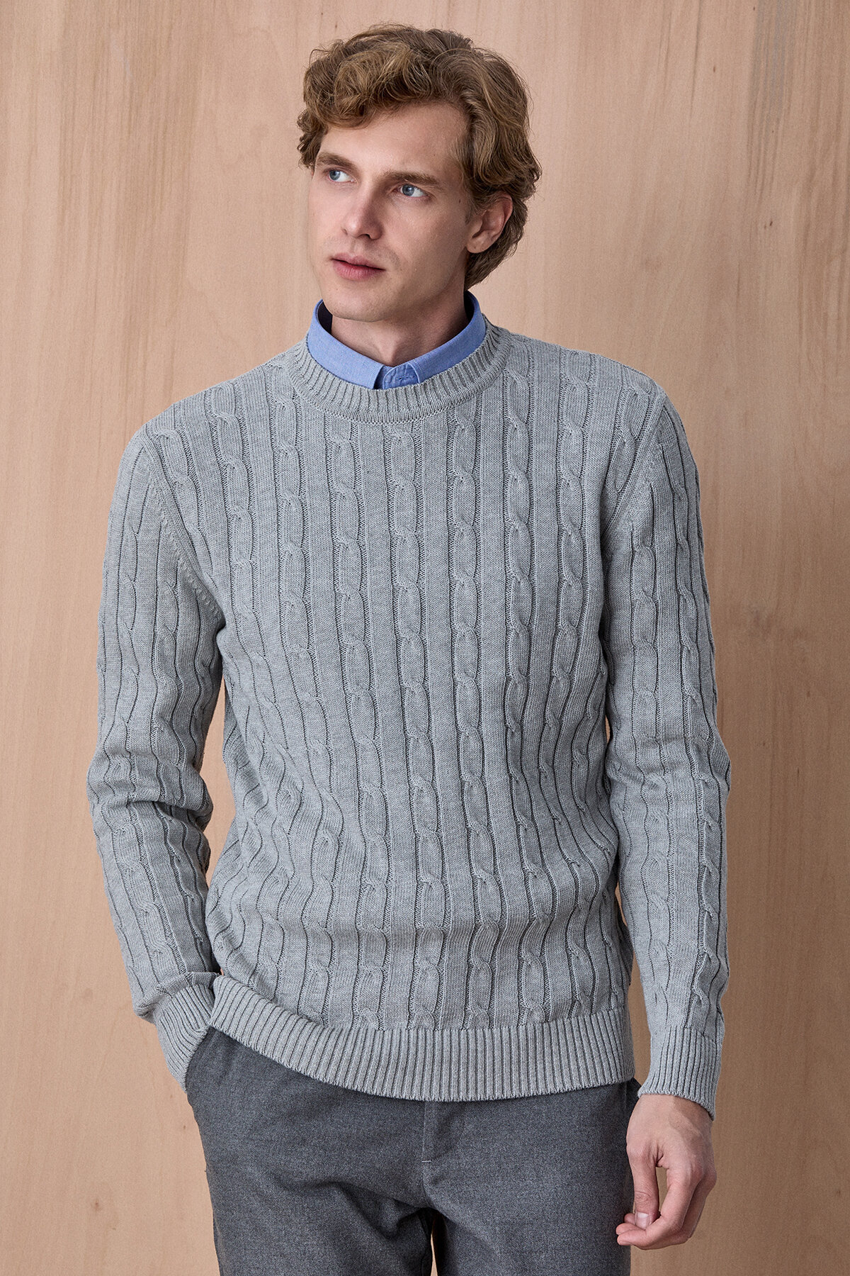 Gri Saç Örgü %100 Pamuk Bisiklet Yaka Kazak