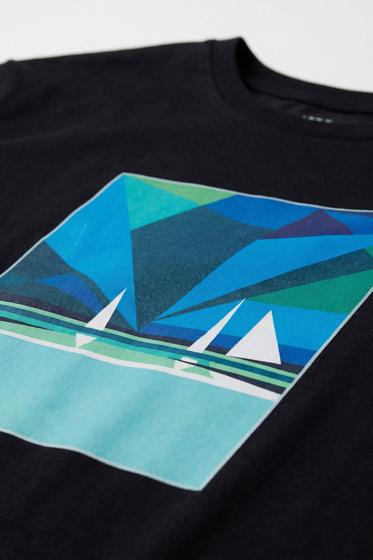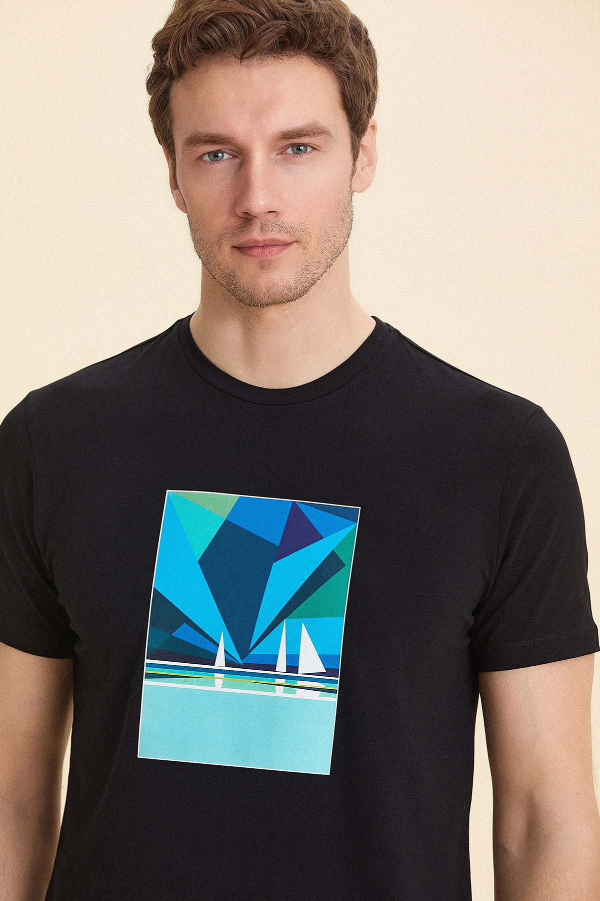 This relaxed-cut casual printed basic t-shirt is a product that you can use with any summer combination. It will be your favorite all summer long with its colorful patterned piping detail on the back of the neck and its energetic front print.