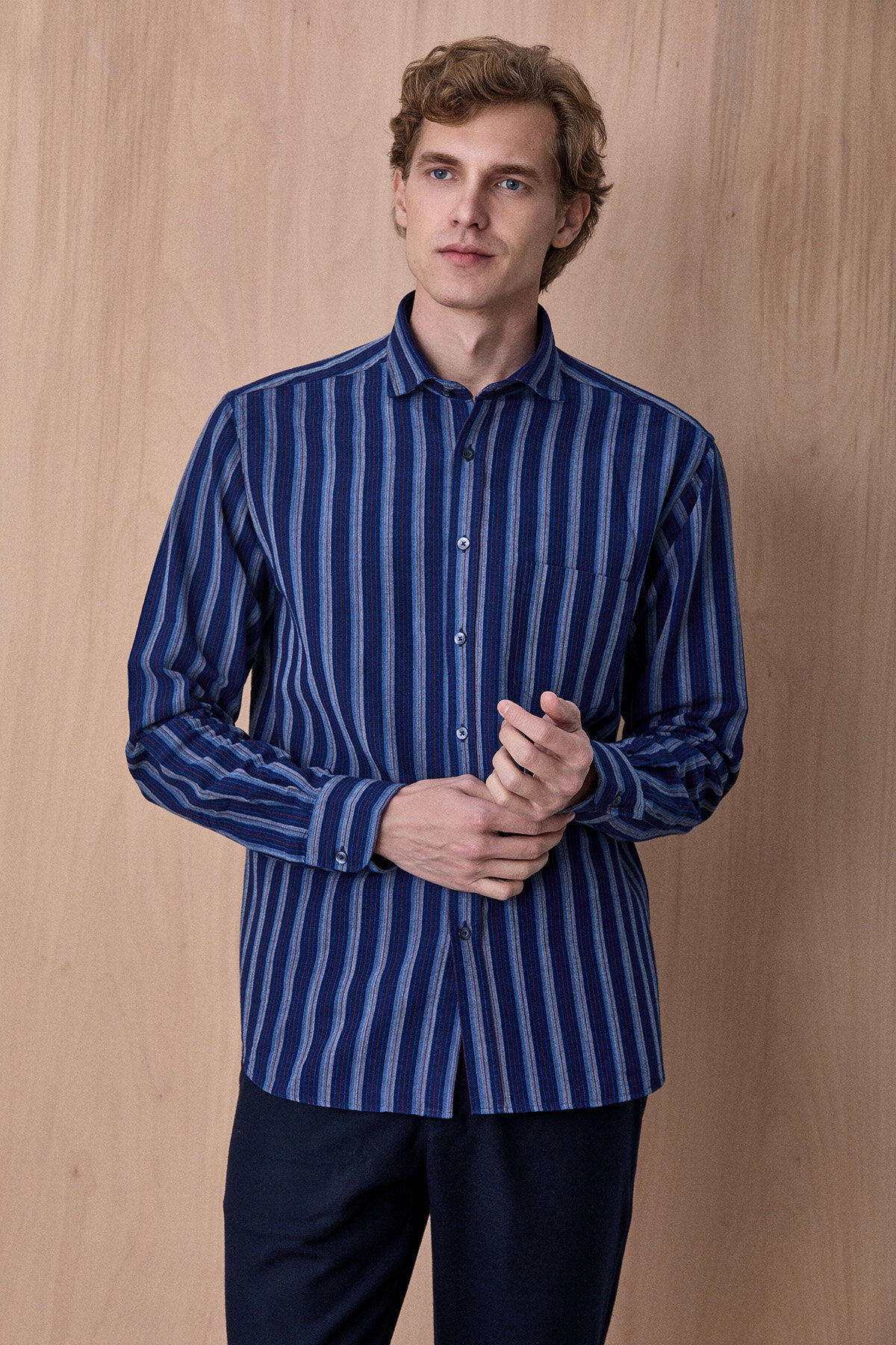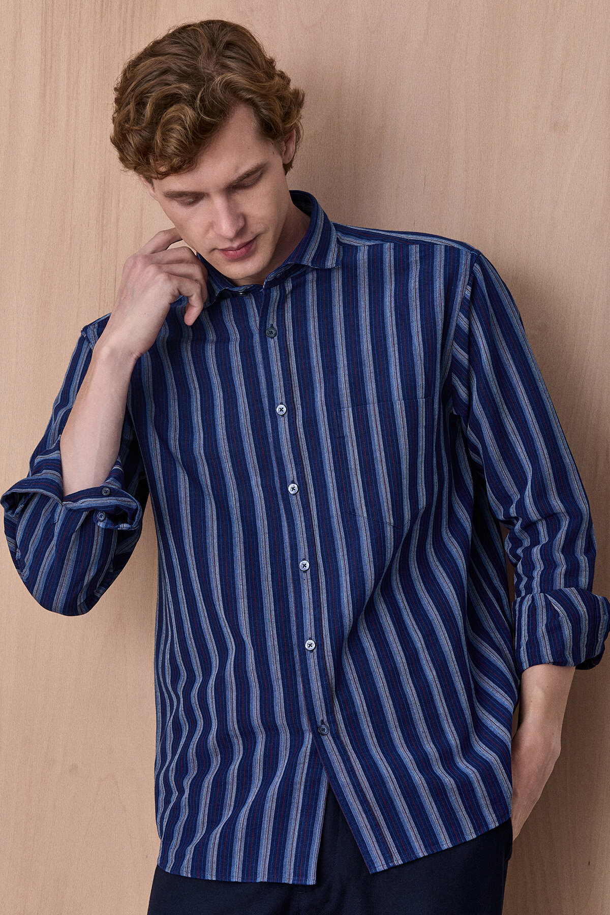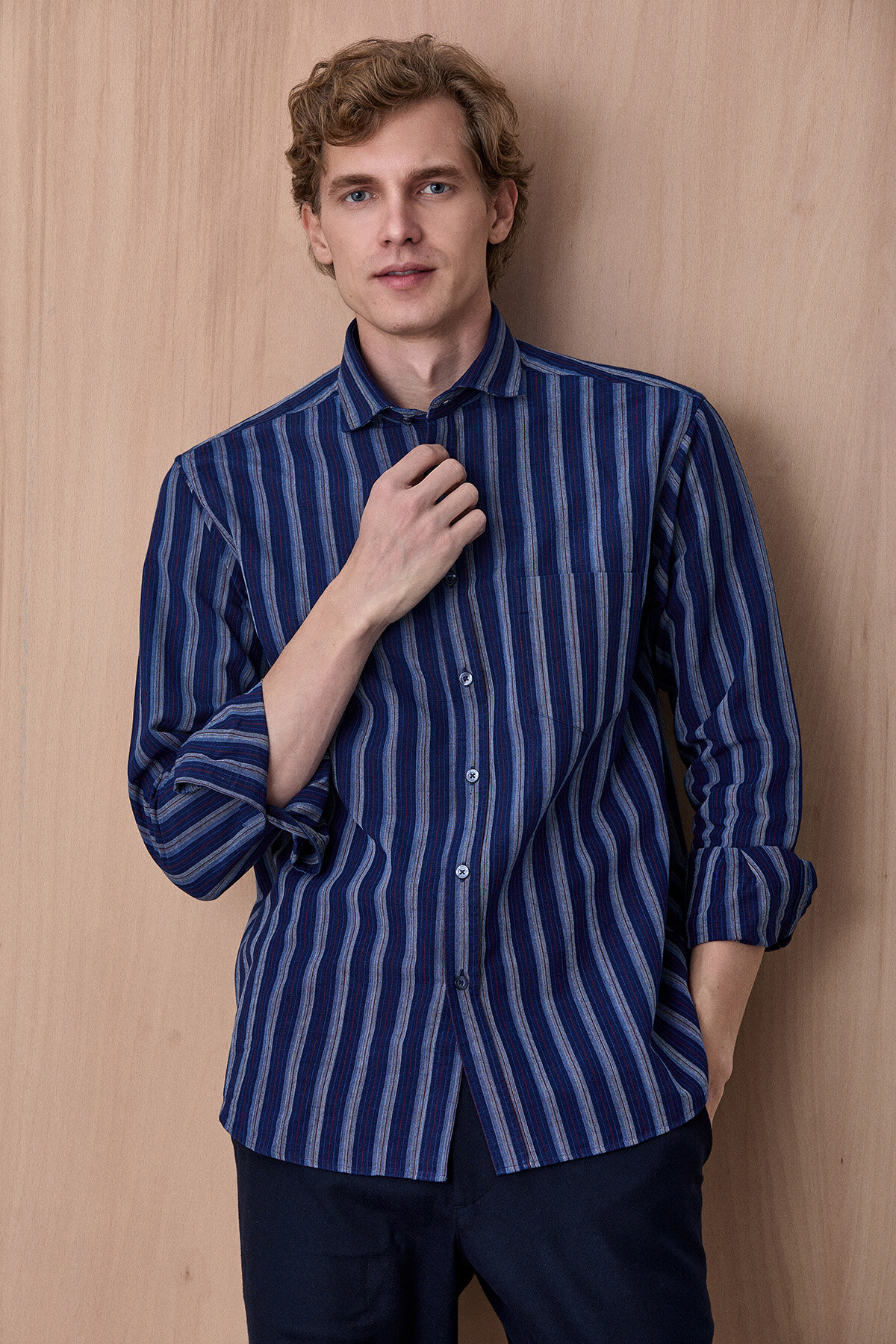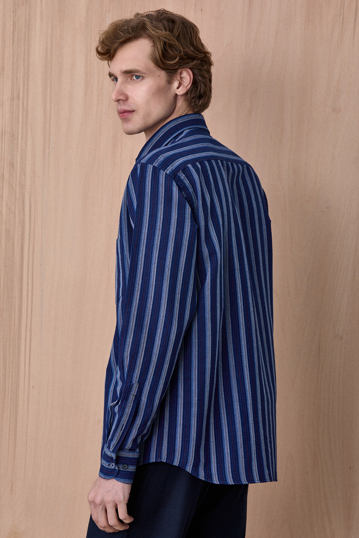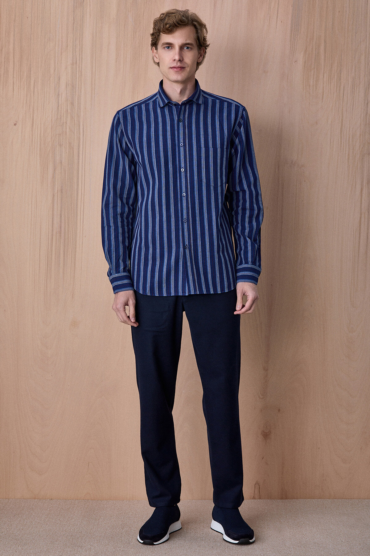 Esrum Lacivert Çizgili %100 Pamuk Gömlek, klasik gömlek stilini modern çizgi detaylarıyla birleştiren zamansız bir parçadır. Nefes alabilen %100 pamuklu kumaşı sayesinde gün boyu konfor sağlarken, dikey çizgili tasarımı ürüne dinamik ve şık bir görünüm kazandırır. Günlük şehir stilinden smart casual kombinlere kadar birçok farklı tarzla kolayca uyum sağlayan çok yönlü bir gömlektir.