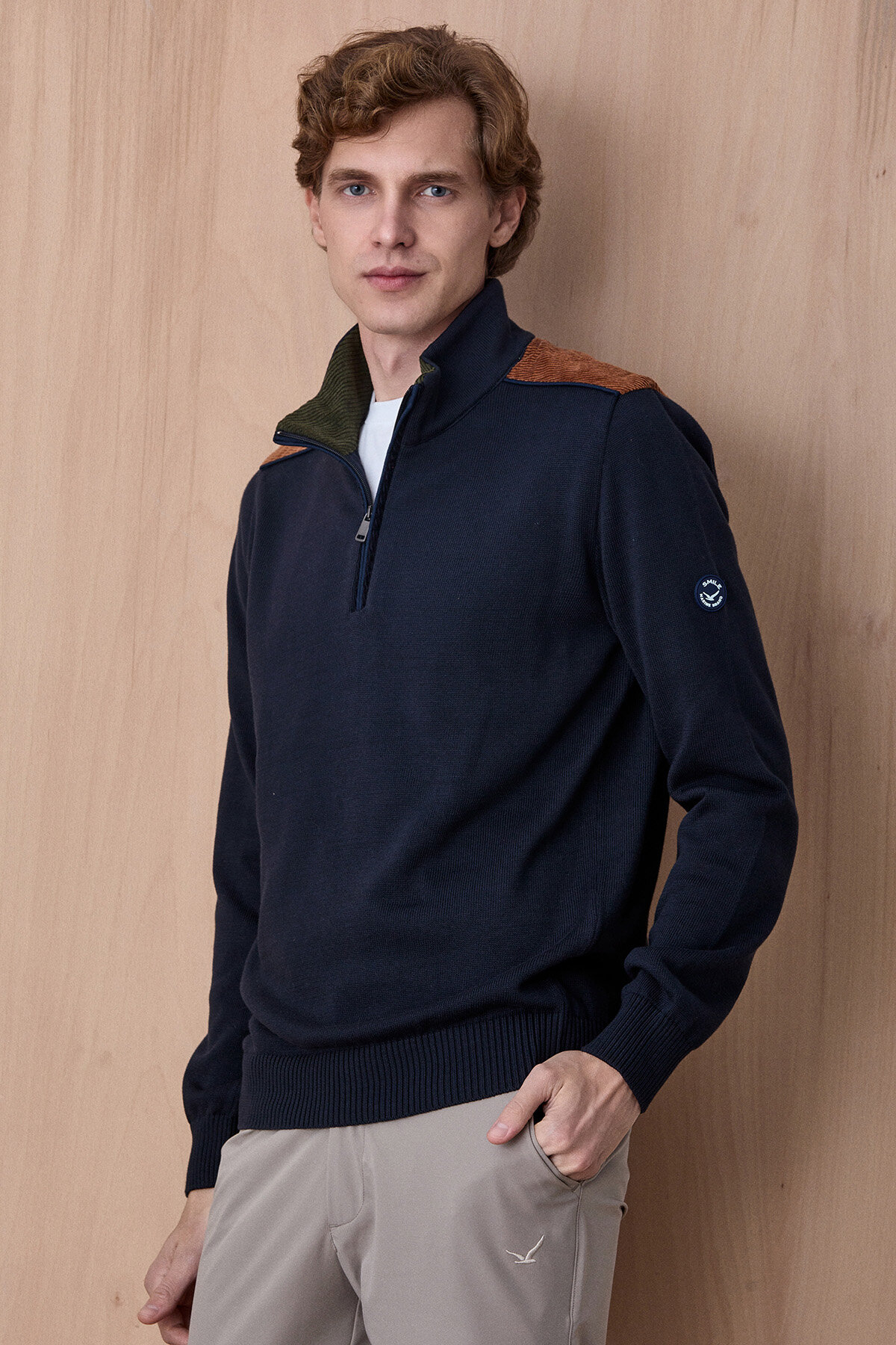 - • Yarım fermuarlı yüksek yaka tasarımı