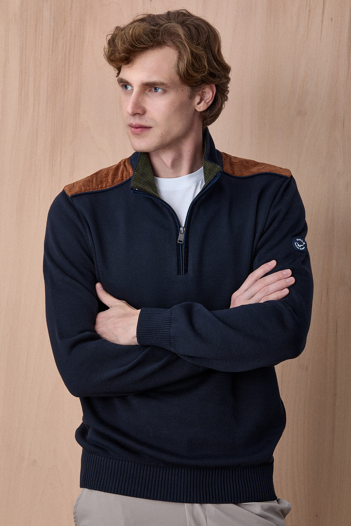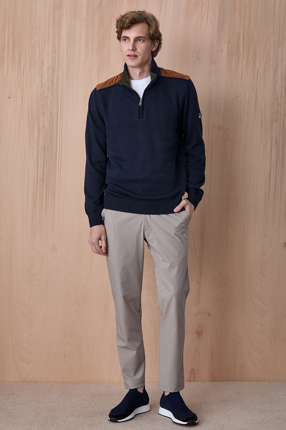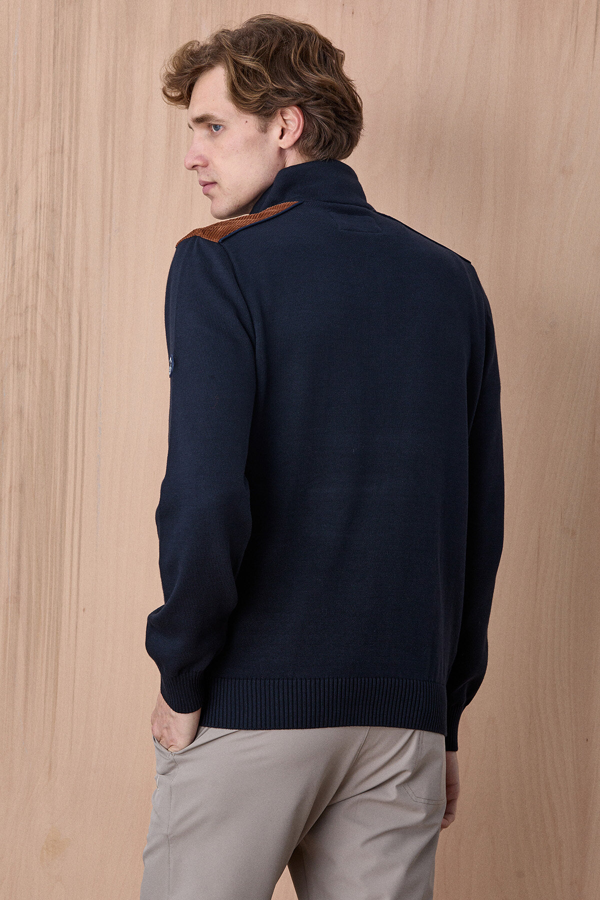 Fogna Lacivert %100 Pamuk Omuz Detaylı Yarım Fermuarlı Kazak, modern tasarımı ve güçlü duruşu ile günlük stilinize karakter kazandırır. %100 pamuklu kumaşı sayesinde nefes alabilen ve konforlu bir kullanım sunarken, yarım fermuarlı yüksek yaka tasarımı ürüne sportif ve dinamik bir görünüm katar. Omuz kısmındaki kontrast dokulu detaylar ve kol üzerindeki arma detayı tasarımı zenginleştirirken, şehir stiline uyum sağlayan modern bir görünüm oluşturur.