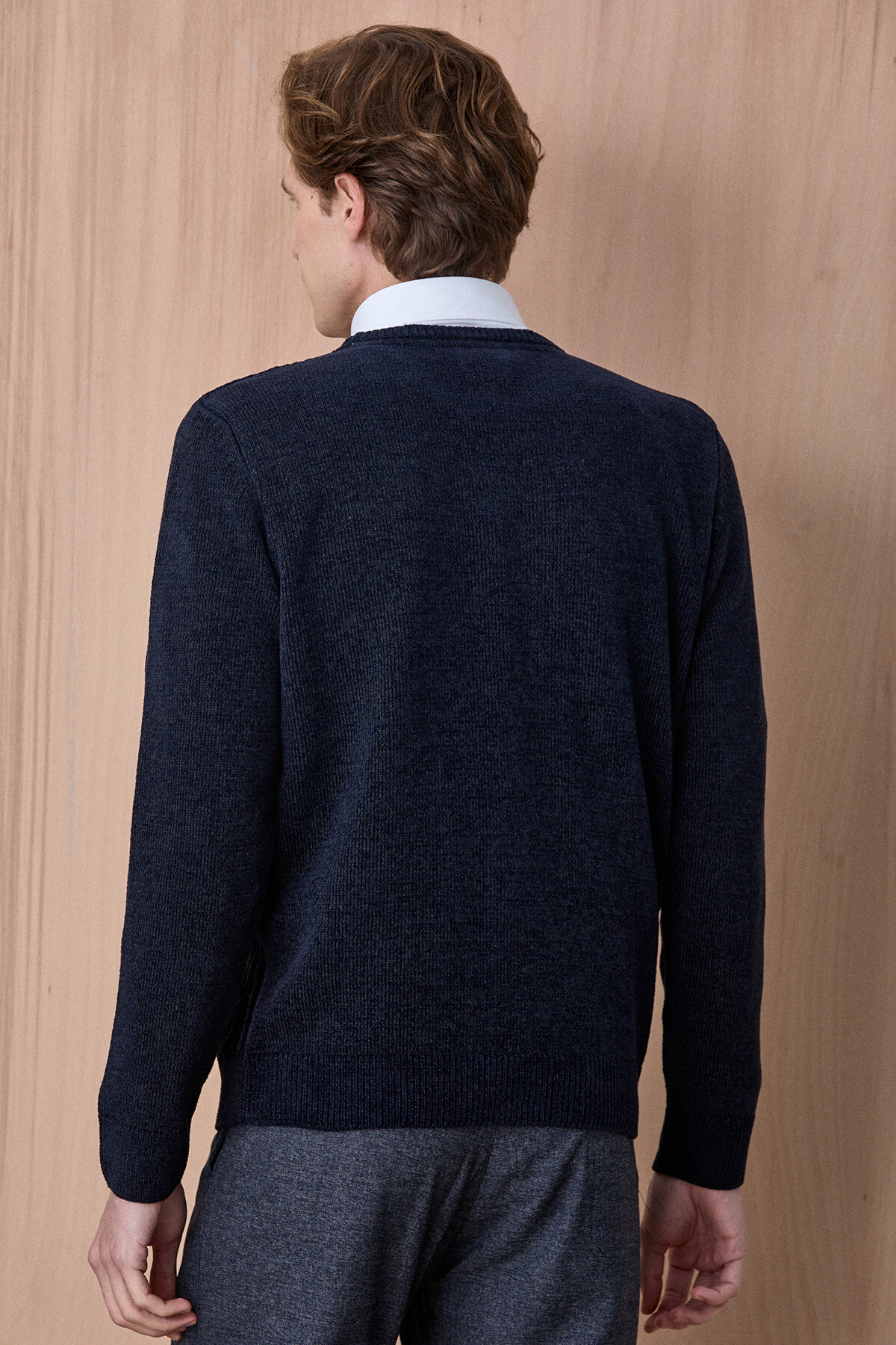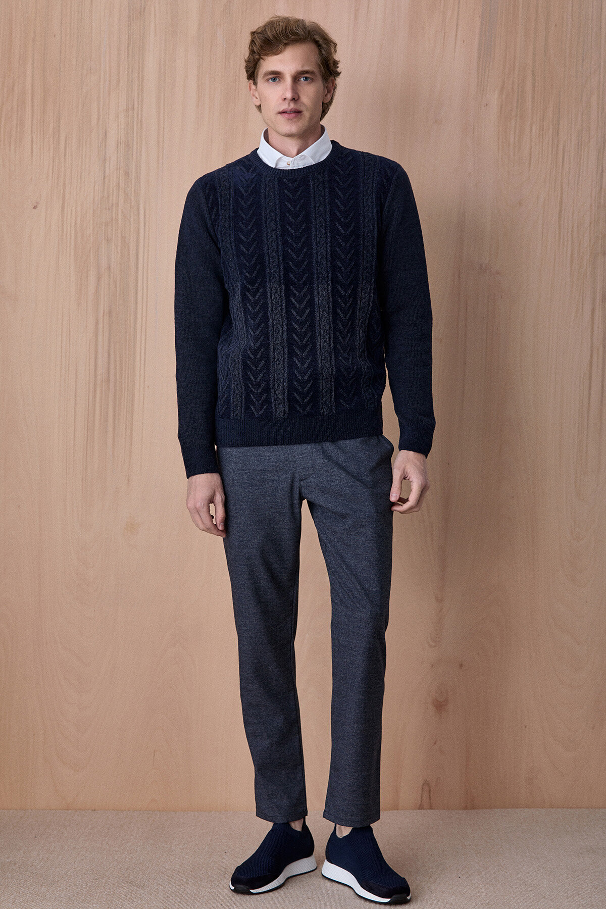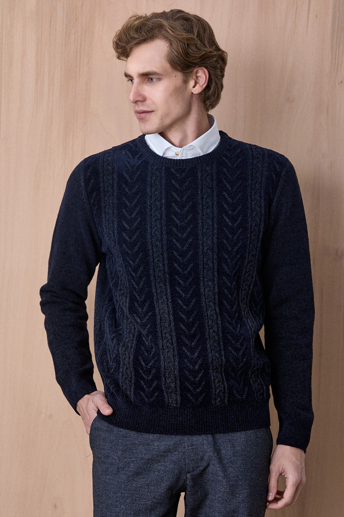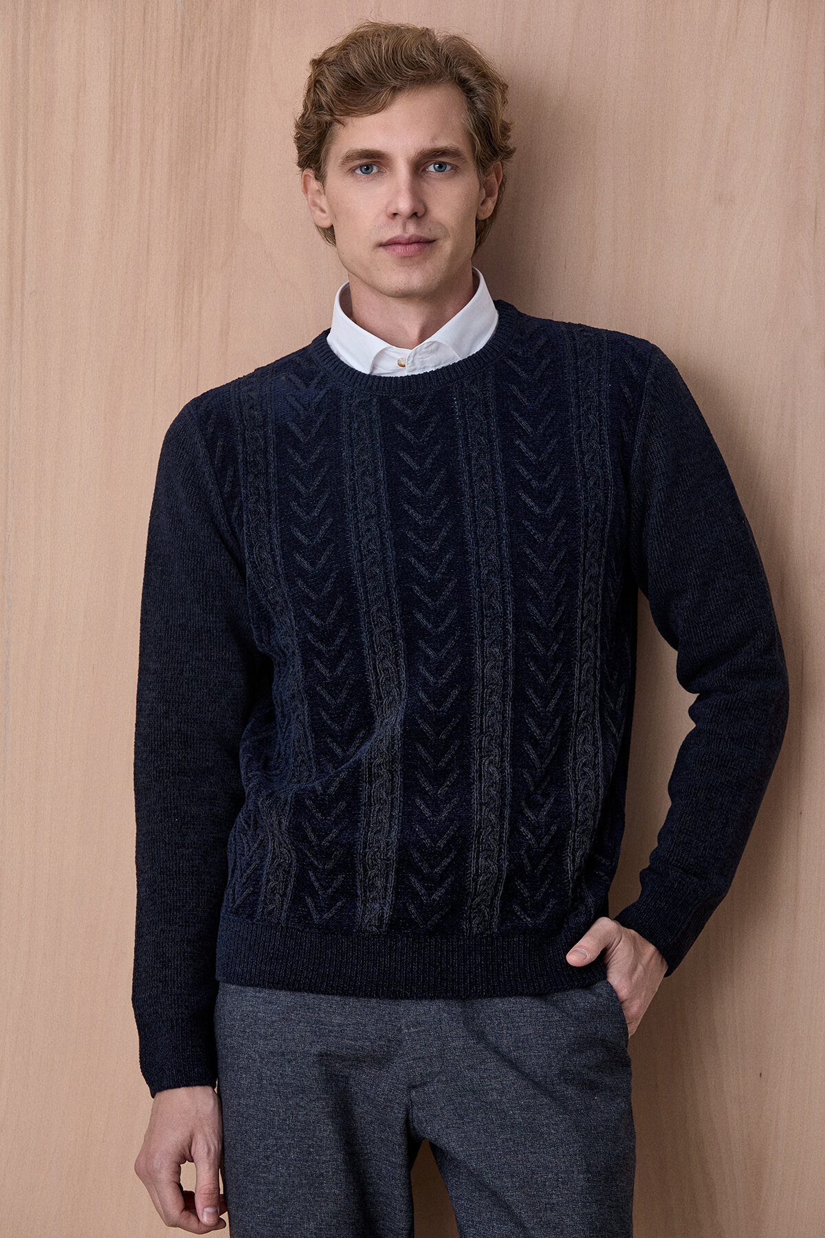 Frier Lacivert Desenli Bisiklet Yaka Triko Kazak, klasik triko dokusunu modern desen detaylarıyla bir araya getiren şık bir parçadır. Yumuşak dokulu akrilik ve pamuk karışımlı kumaşı sayesinde gün boyu konfor sağlarken, ön yüzeyde yer alan desenli örgü tasarımı ürüne karakter kazandırır. Bisiklet yaka formu sayesinde gömleklerle birlikte kullanılabilir ve smart casual kombinler için ideal bir tamamlayıcı olur.