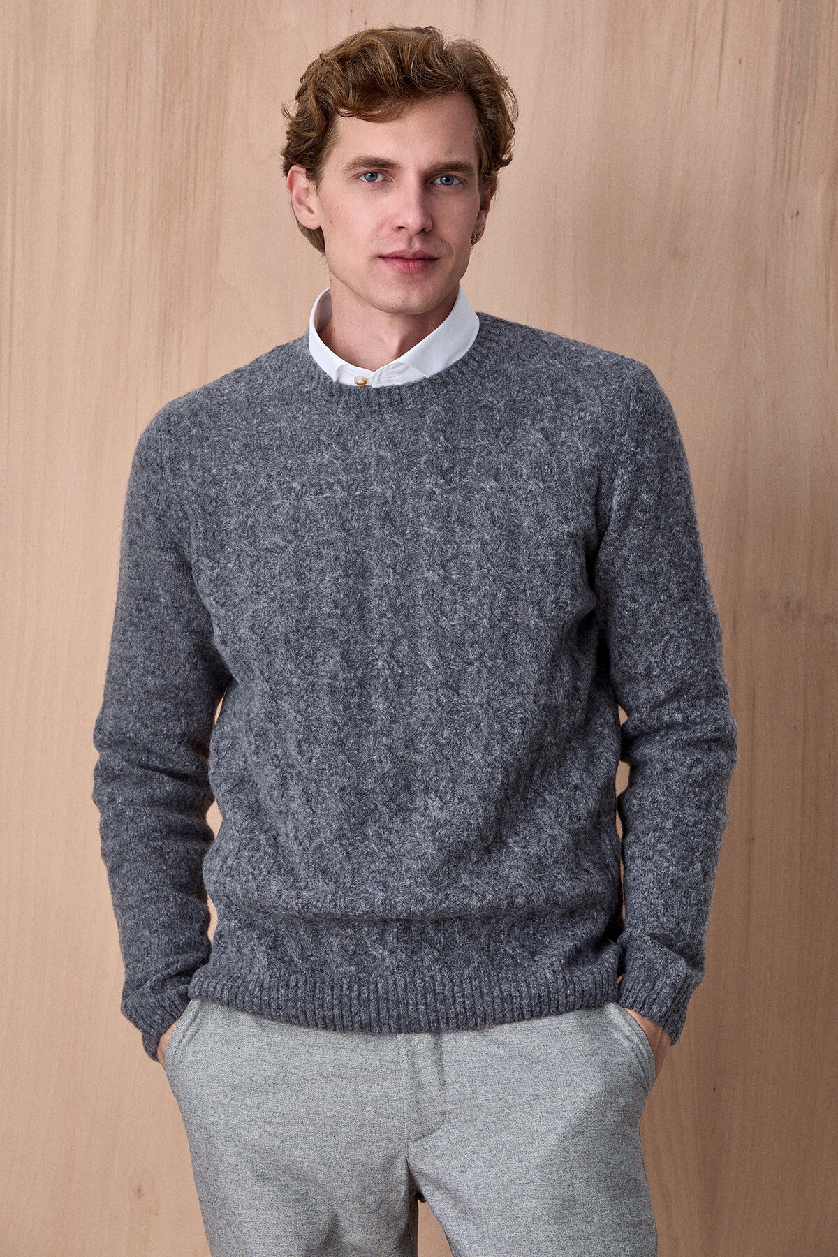 Gri Yünlü Saç Örgü Bisiklet Yaka Kazak