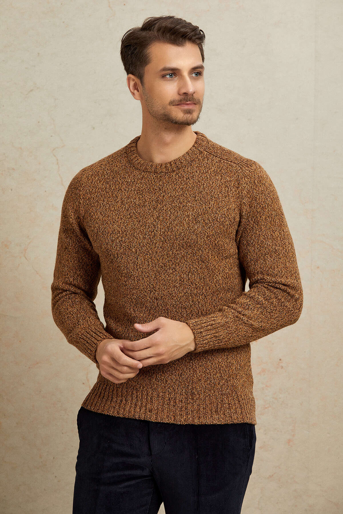 Kahverengi %100 Pamuk Yuvarlak Yaka Kazak