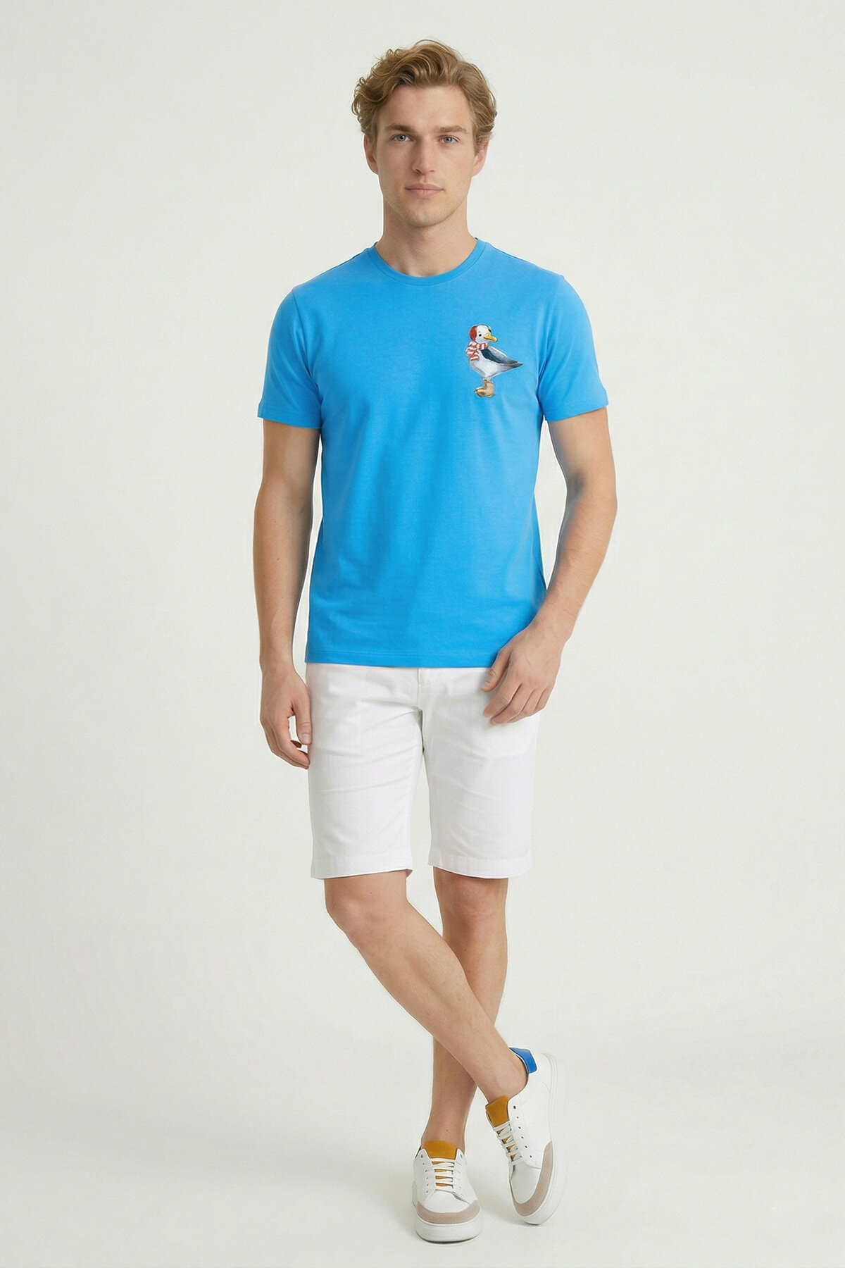 Gulleon Turkuaz Baskılı Pamuklu Tişört, enerjik rengi ve özgün ön baskısı ile yaz stiline dinamik bir dokunuş kazandırır. %95 pamuk ve %5 elastan karışımlı kumaşı sayesinde yumuşak, esnek ve gün boyu konforlu bir kullanım sunar. Ense kısmındaki renkli biye detayı ile fark yaratan bu model, rahat kesimi sayesinde günlük kombinlerde vazgeçilmez bir parçaya dönüşür.