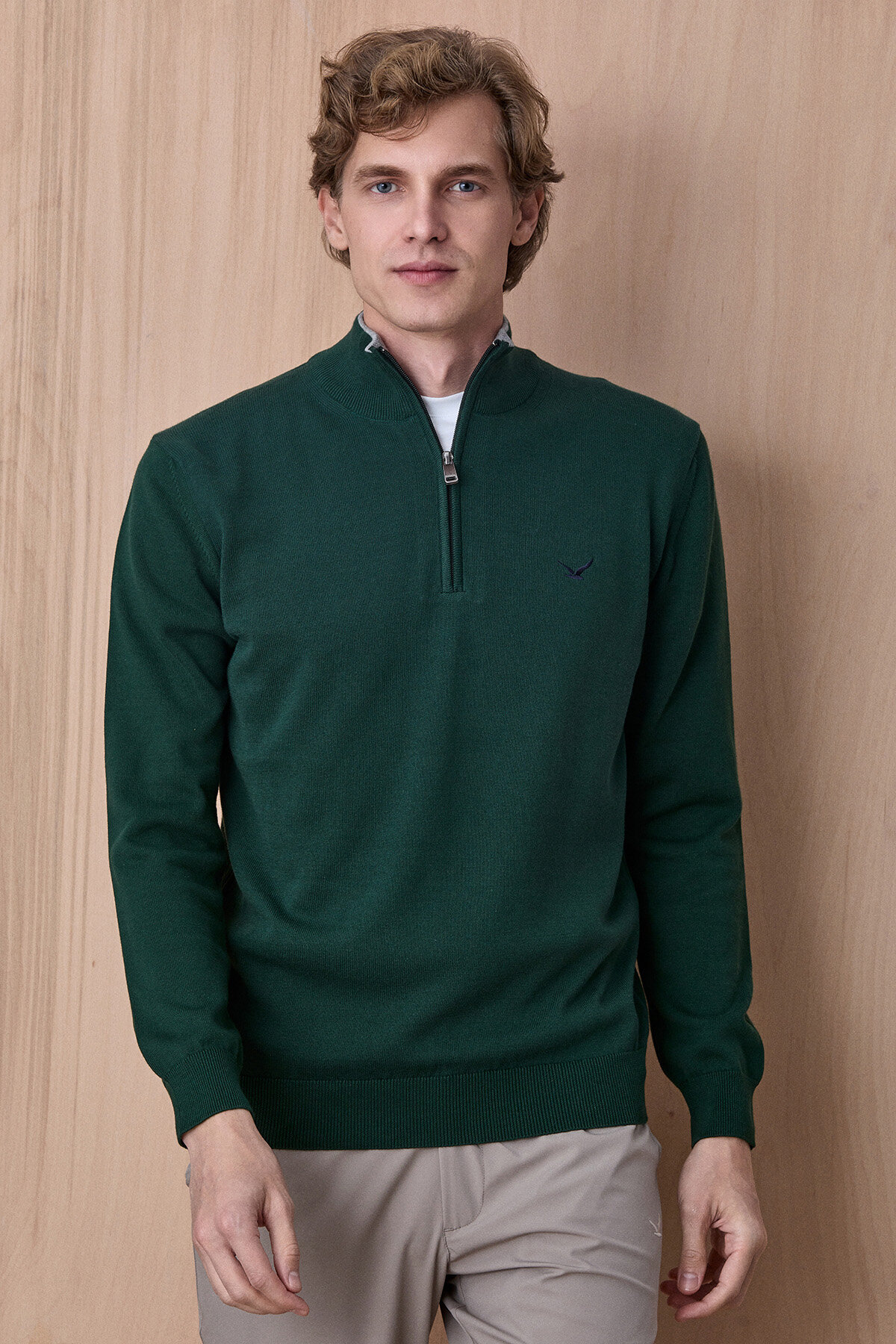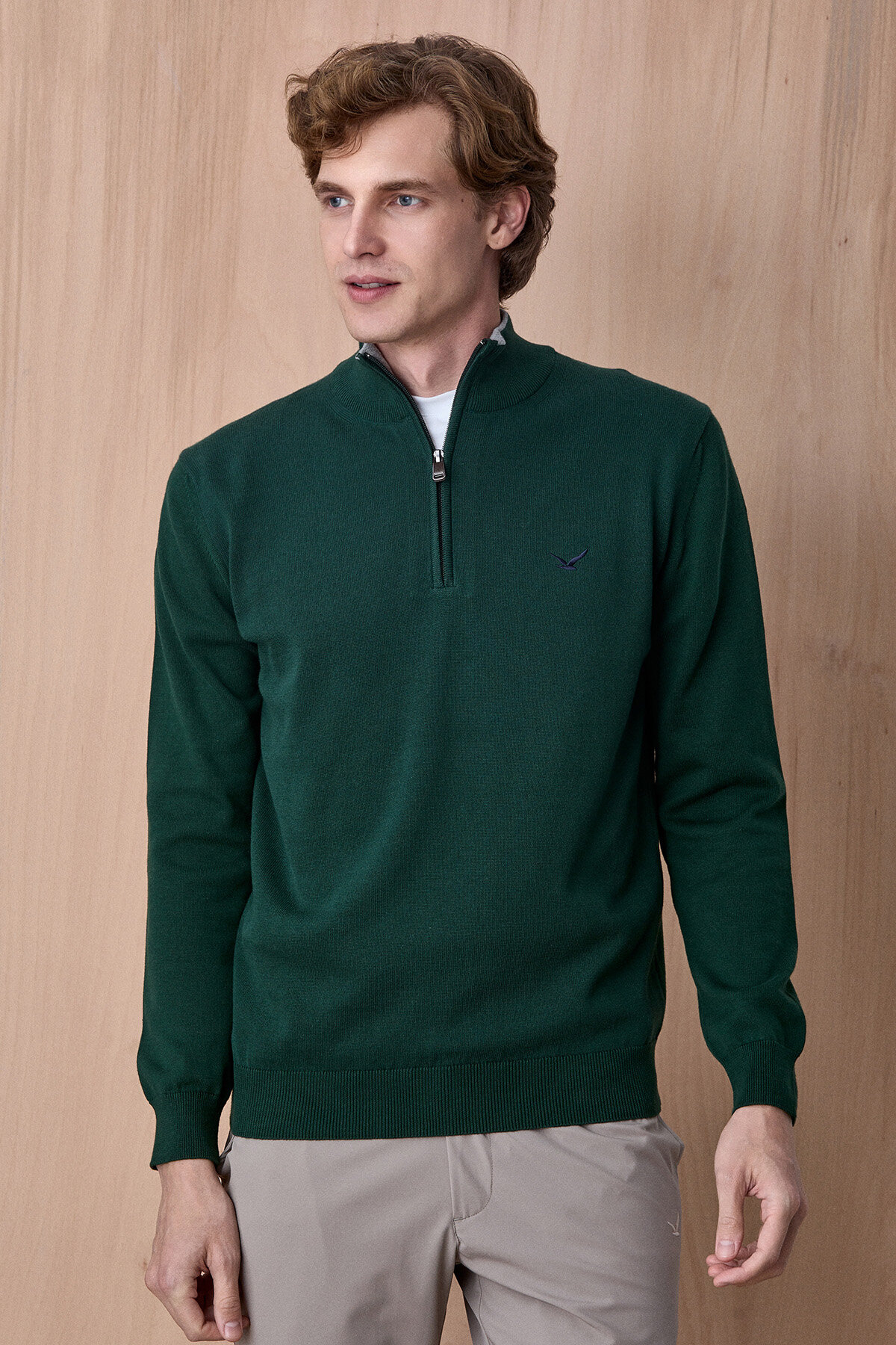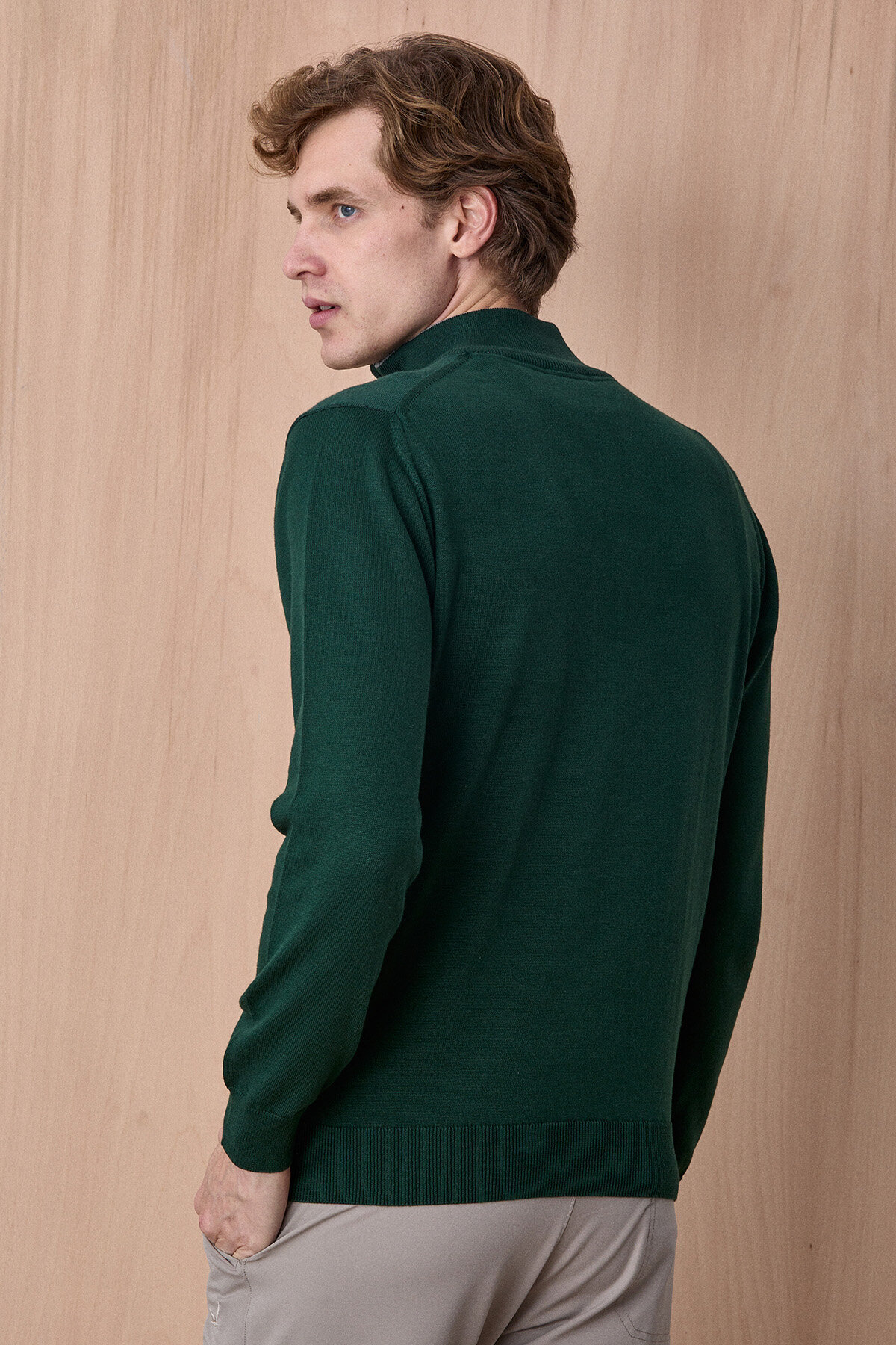 Koyu Yeşil %100 Pamuk Fermuarlı Kazak