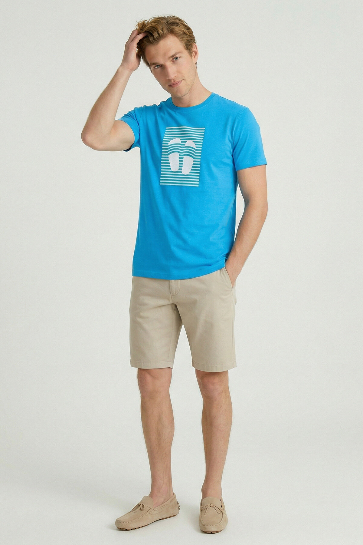 This relaxed-cut casual printed basic t-shirt is a product that you can use with every summer combination. It will be your favorite all summer long with its colorful patterned piping detail on the back of the neck and its energetic front print.