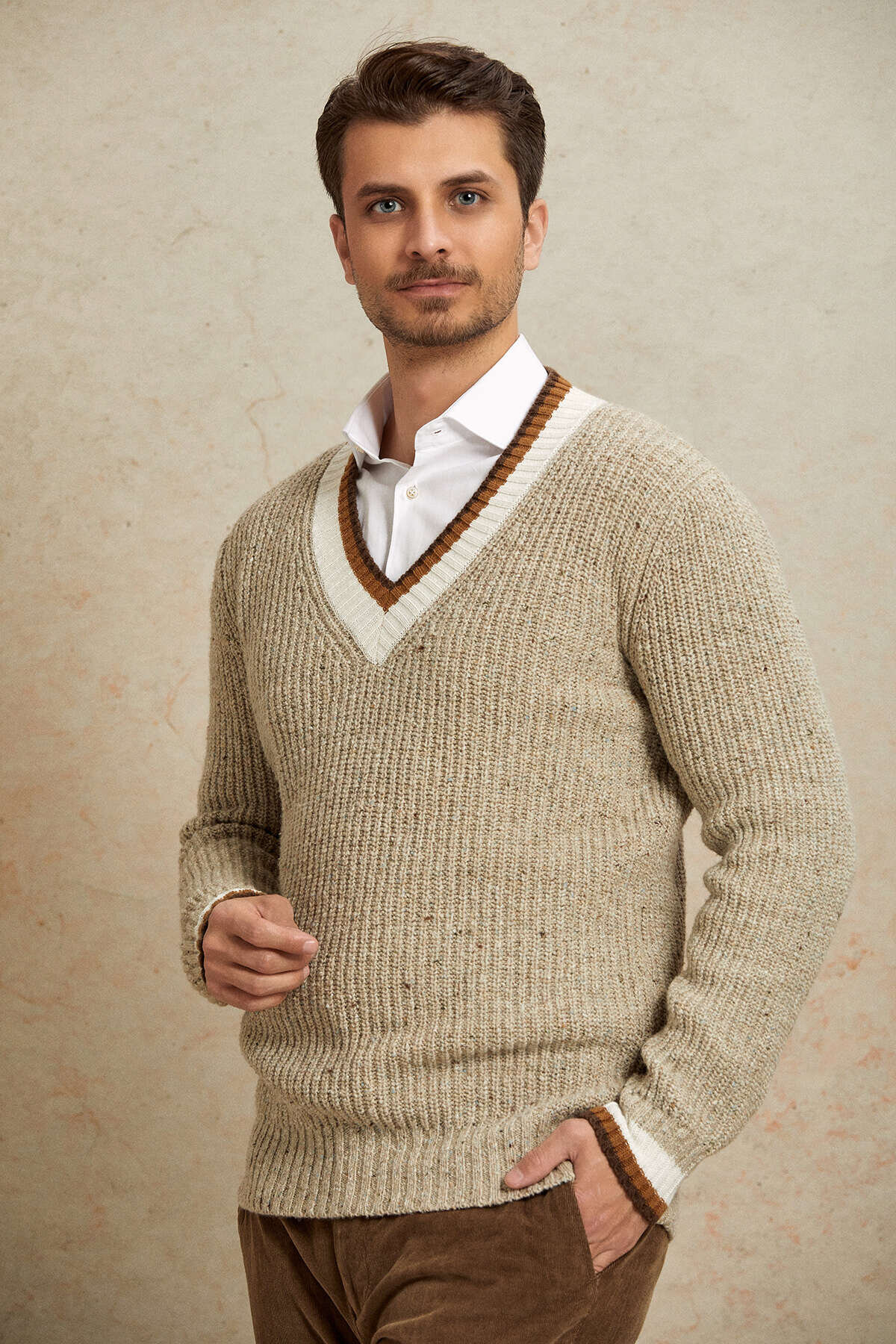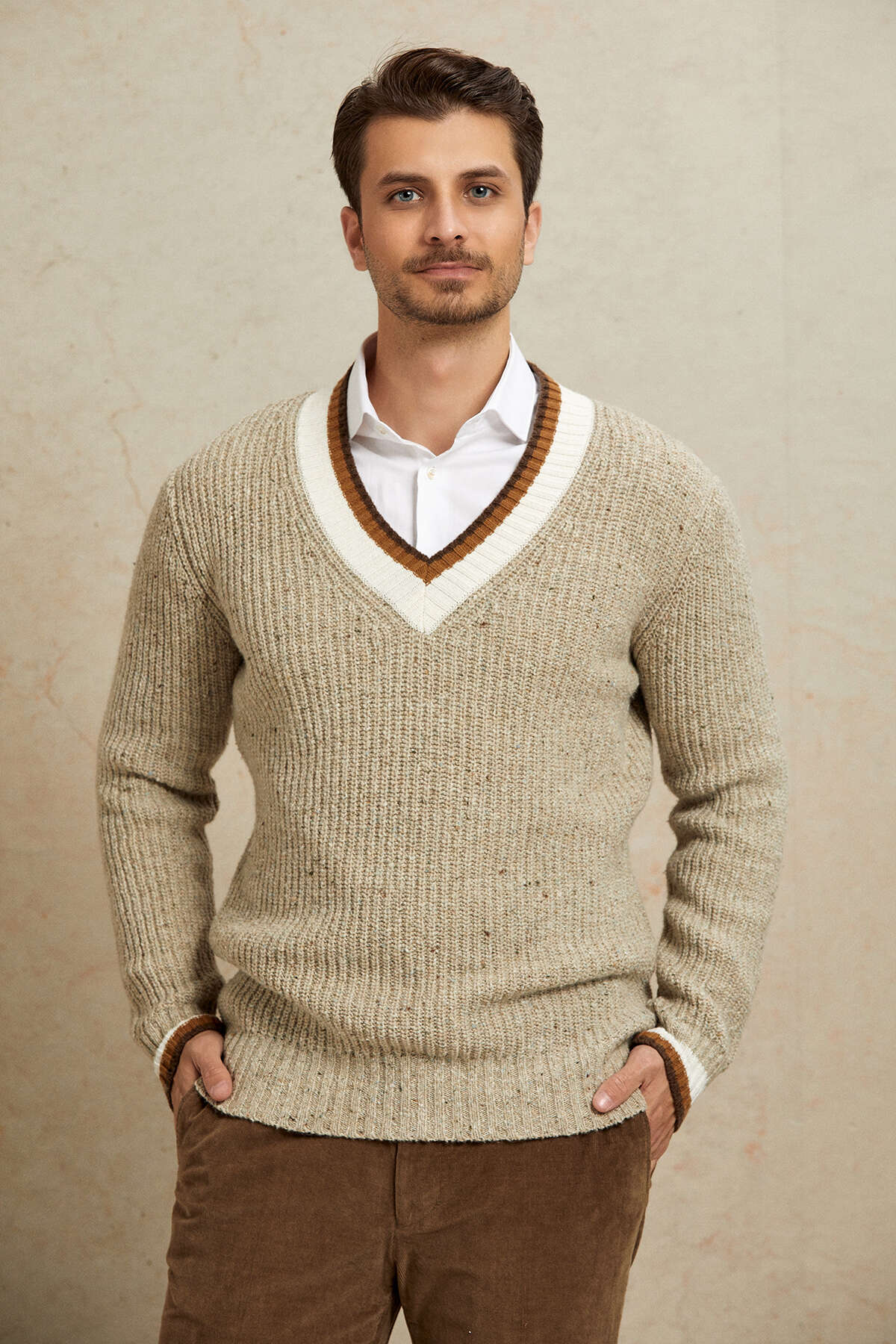 Bej %100 Pamuk V Yaka Kazak