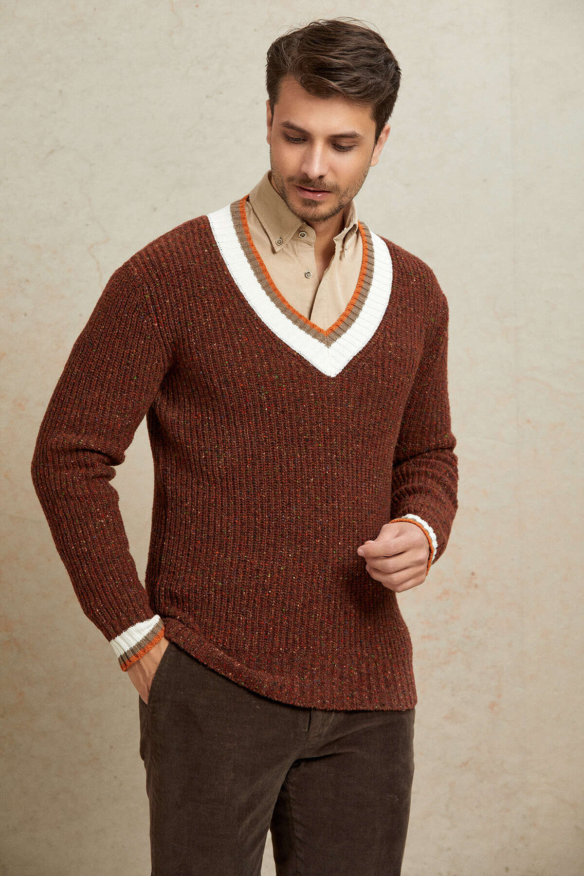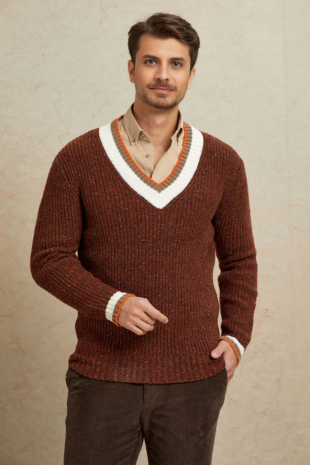 Heimar Kiremit %100 Pamuk V Yaka Triko Kazak, doğal tonları ve klasik tasarımı ile zamansız bir stil sunar. %100 pamuklu kumaşı sayesinde yumuşak, nefes alabilen ve konforlu bir kullanım sağlar. V yaka detayı ile gömlek kombinlerinde şık bir görünüm elde ederken, dokulu triko yapısı ürüne karakter katar. Günlük ve smart casual stilin vazgeçilmez parçalarından biridir.