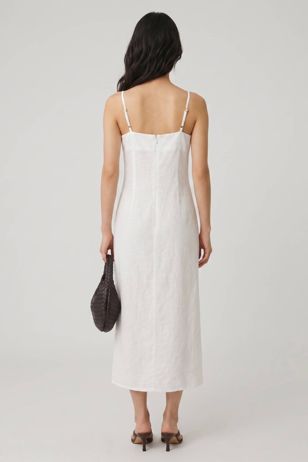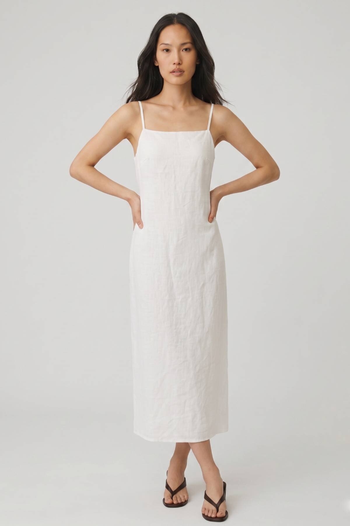 Beyaz %100 Keten Askılı Midi Elbise