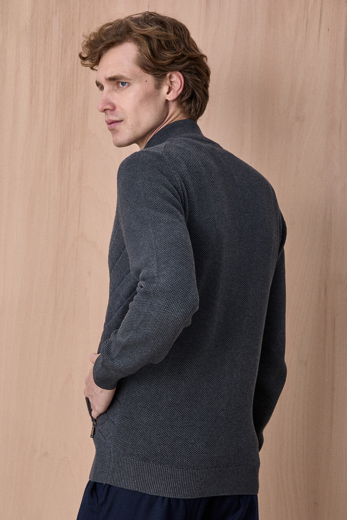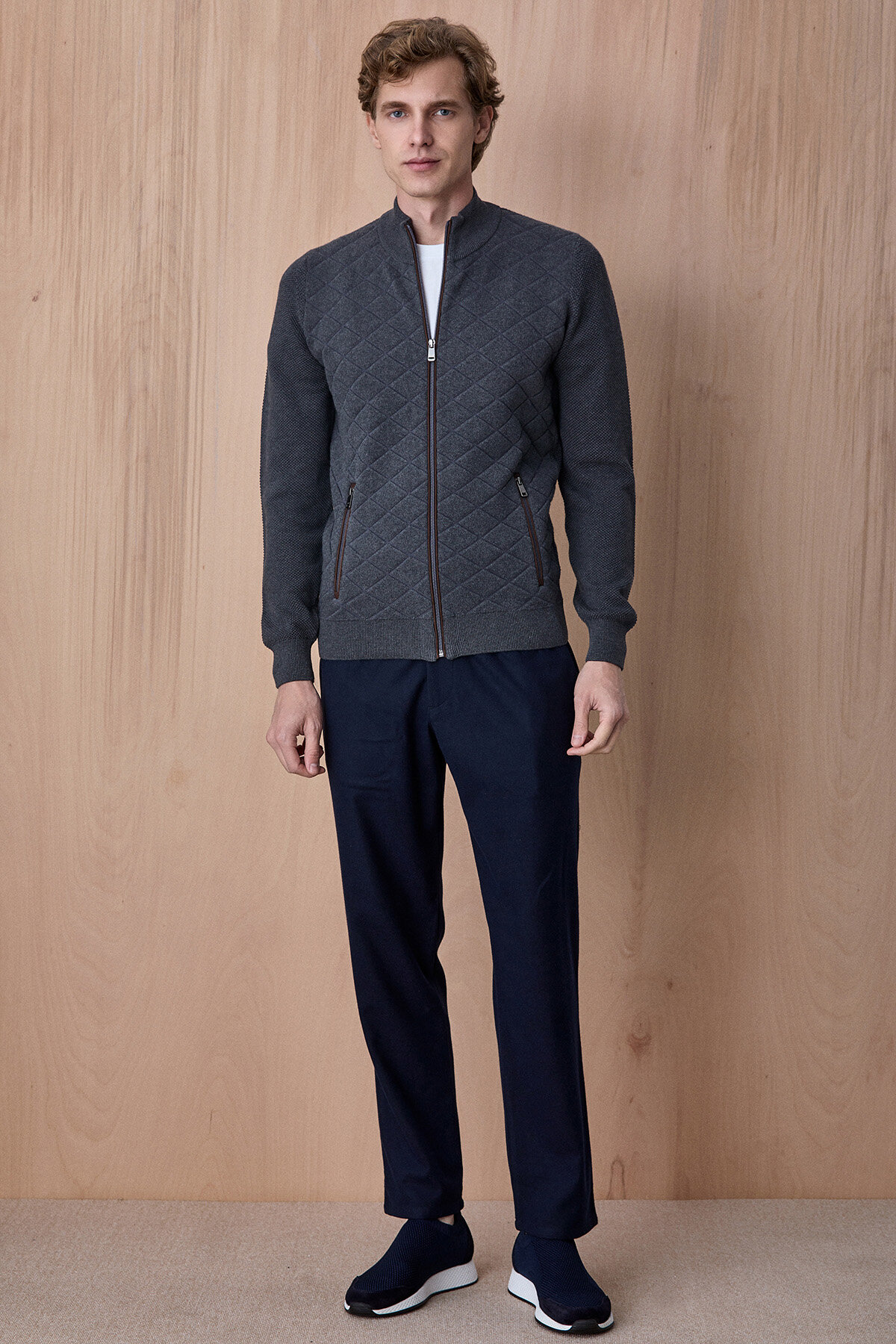 Knit Antrasit Pamuklu Kapitone Detaylı Fermuarlı Triko Ceket, klasik triko konforunu modern ve güçlü bir tasarım diliyle bir araya getirir. Ön yüzeyde yer alan kapitone desen, ürüne sofistike bir görünüm kazandırırken; dokulu triko kollar hareket özgürlüğü ve konfor sağlar. Fermuarlı yapısı ve dik yaka detayı ile fonksiyonel kullanım sunan bu model, hem günlük hem de smart casual kombinlerde şık bir tamamlayıcı olarak öne çıkar.