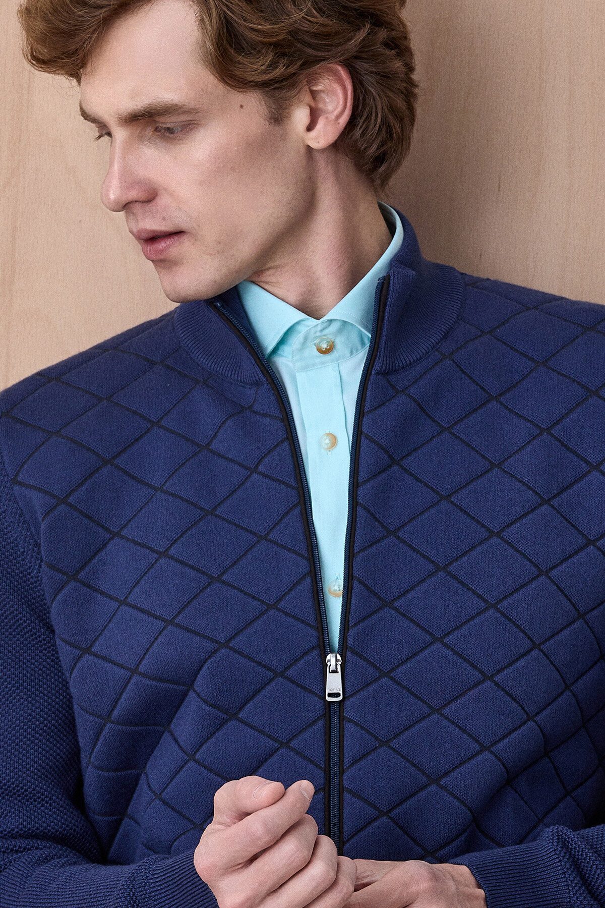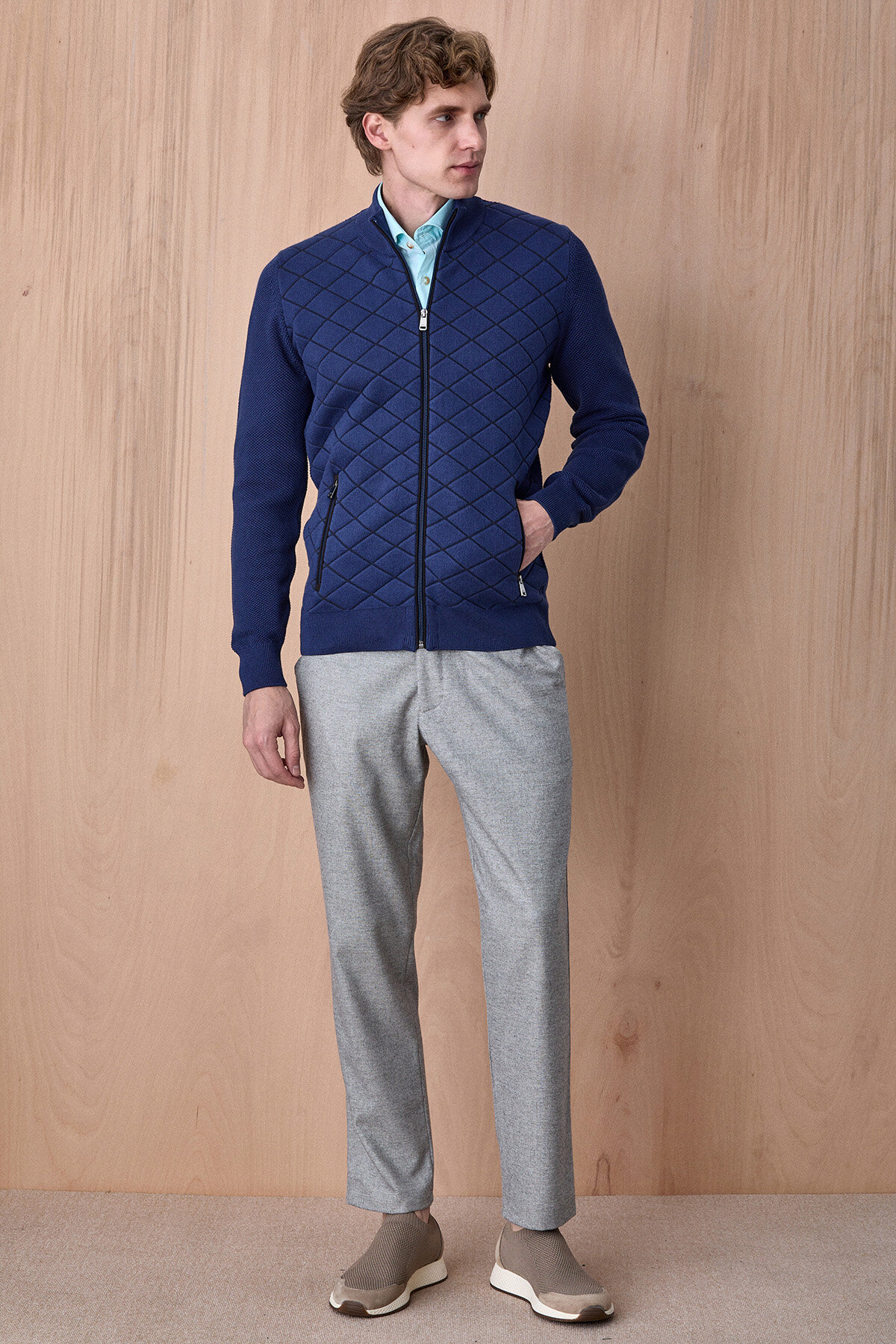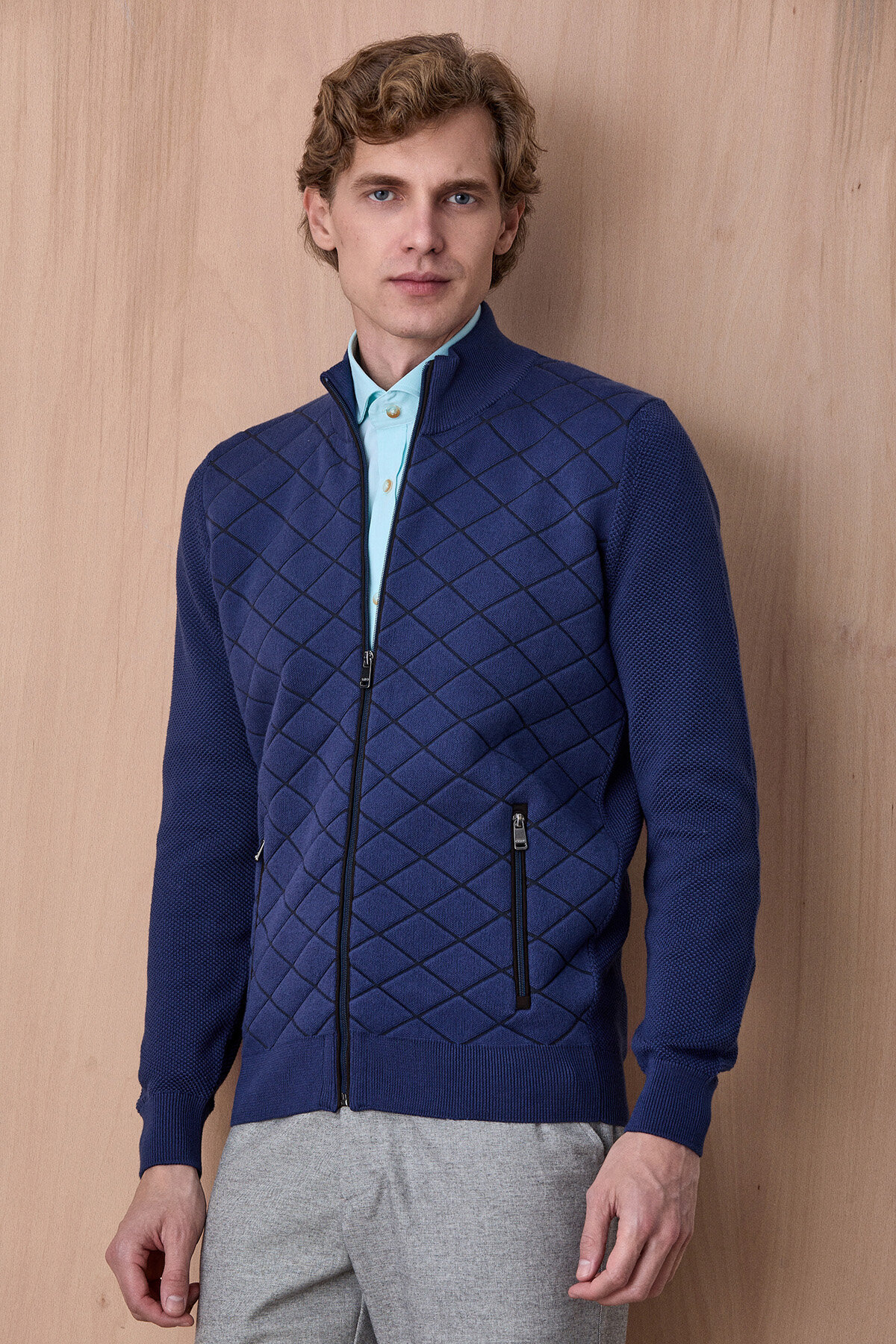 Knit Indigo Pamuklu Kapitone Detaylı Fermuarlı Triko Ceket, klasik triko konforunu modern ve güçlü bir tasarım diliyle bir araya getirir. Ön yüzeyde yer alan kapitone desen, ürüne sofistike bir görünüm kazandırırken; dokulu triko kollar hareket özgürlüğü ve konfor sağlar. Fermuarlı yapısı ve dik yaka detayı ile fonksiyonel kullanım sunan bu model, hem günlük hem de smart casual kombinlerde şık bir tamamlayıcı olarak öne çıkar.