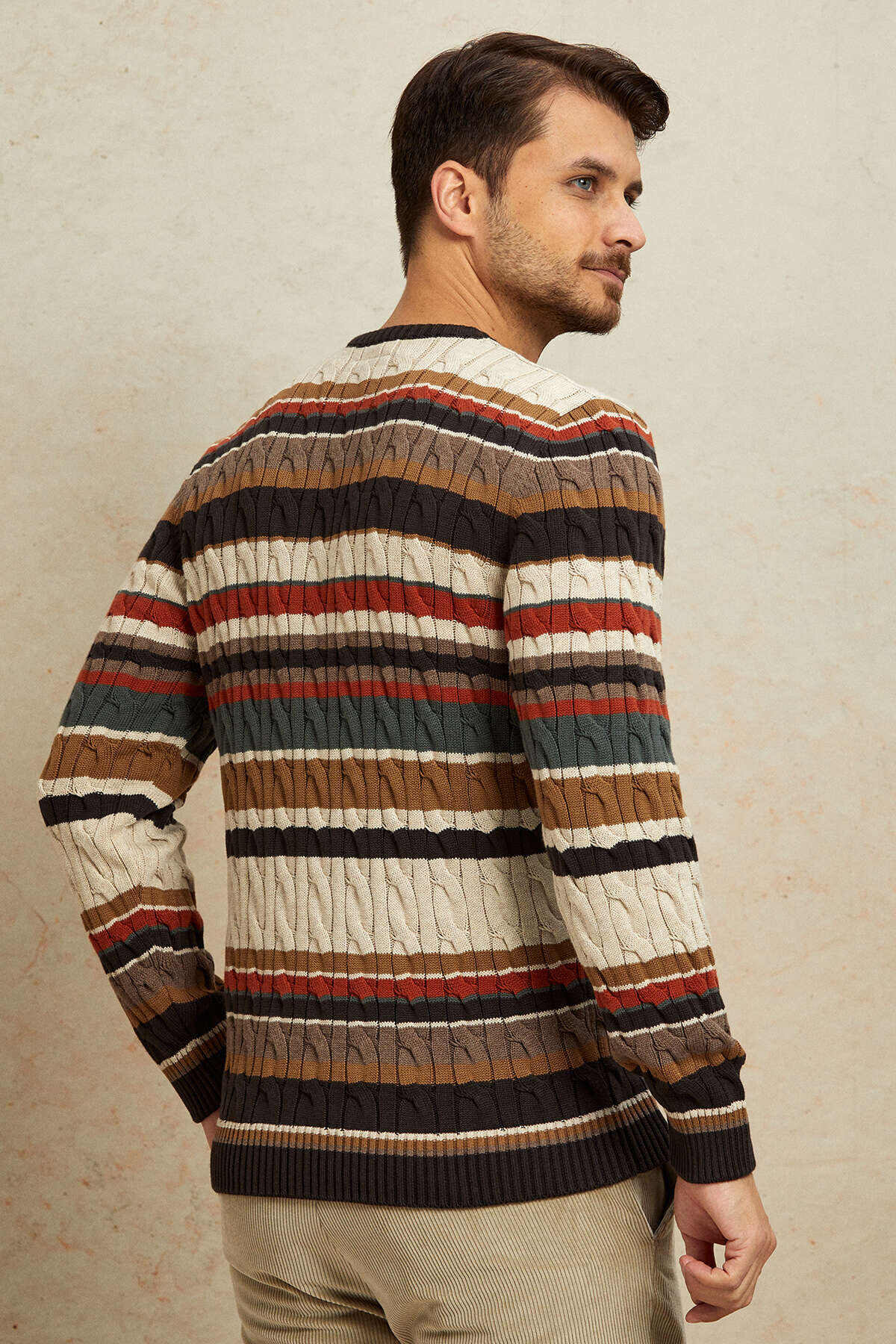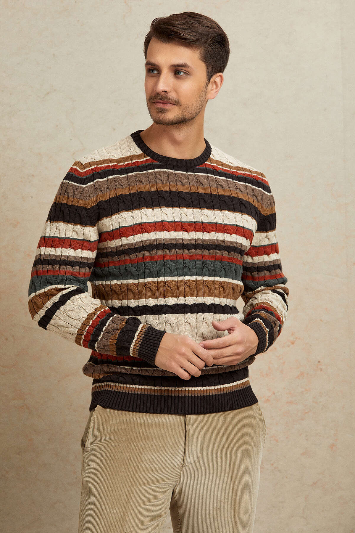 Land Kahverengi Çizgili %100 Pamuk Bisiklet Yaka Kazak, dinamik çizgi deseni ve zengin dokusuyla modern bir stil sunar. Farklı tonların uyum içinde kullanıldığı tasarım, kazak üzerinde hareketli ve dikkat çekici bir görünüm oluştururken; %100 pamuklu yapısı sayesinde gün boyu konfor ve nefes alabilirlik sağlar. Yumuşak dokusu ve dengeli kesimi ile hem günlük hem de smart casual kombinlerde rahatlıkla tercih edilebilecek şık bir parçadır.