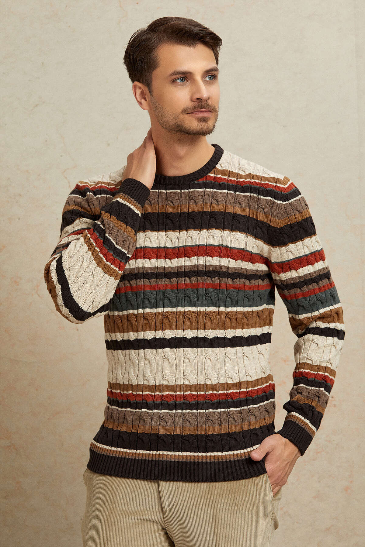 Kahverengi %100 Pamuk Yuvarlak Yaka Kazak