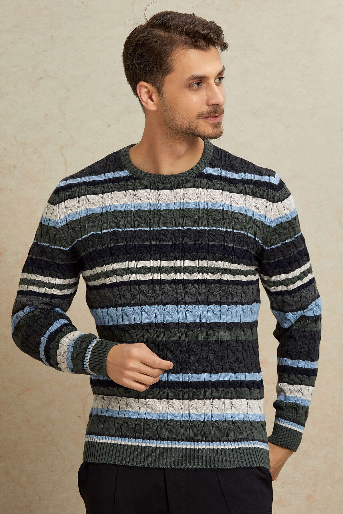 Land Yeşil Çizgili %100 Pamuk Bisiklet Yaka Kazak, dinamik çizgi deseni ve zengin dokusuyla modern bir stil sunar. Farklı tonların uyum içinde kullanıldığı tasarım, kazak üzerinde hareketli ve dikkat çekici bir görünüm oluştururken; %100 pamuklu yapısı sayesinde gün boyu konfor ve nefes alabilirlik sağlar. Yumuşak dokusu ve dengeli kesimi ile hem günlük hem de smart casual kombinlerde rahatlıkla tercih edilebilecek şık bir parçadır.