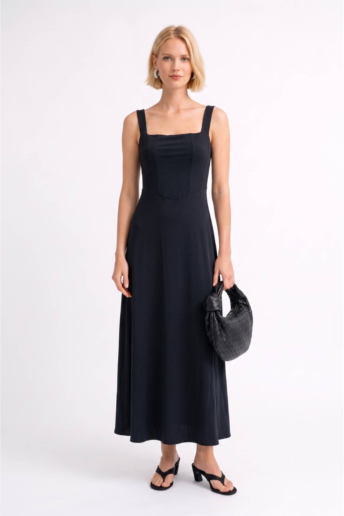 Siyah Askılı Midi Elbise