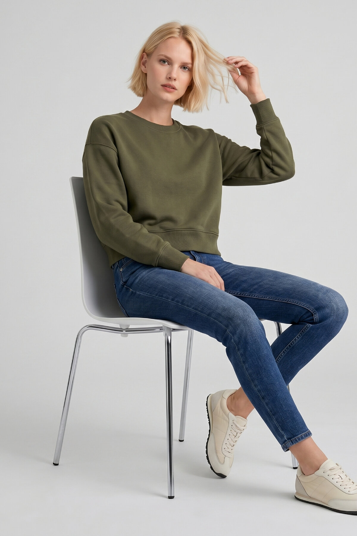 Marcia Haki %100 Pamuk Crop Sweatshirt, sade tasarımı ve modern kesimiyle günlük stilin güçlü tamamlayıcılarından biridir. %100 pamuk kumaşı sayesinde yumuşak ve nefes alabilir bir kullanım sunarken, gün boyu konfor sağlar. Kısa formu ve dengeli kalıbı ile hem sportif hem de casual kombinlere kolayca uyum sağlayan bu parça, minimal görünümüyle zamansız bir stil sunar.