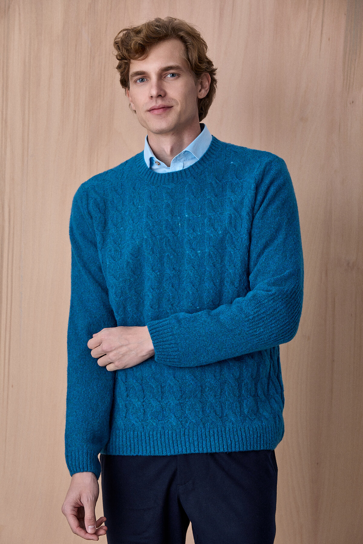Petrol Yünlü Saç Örgü Bisiklet Yaka Kazak