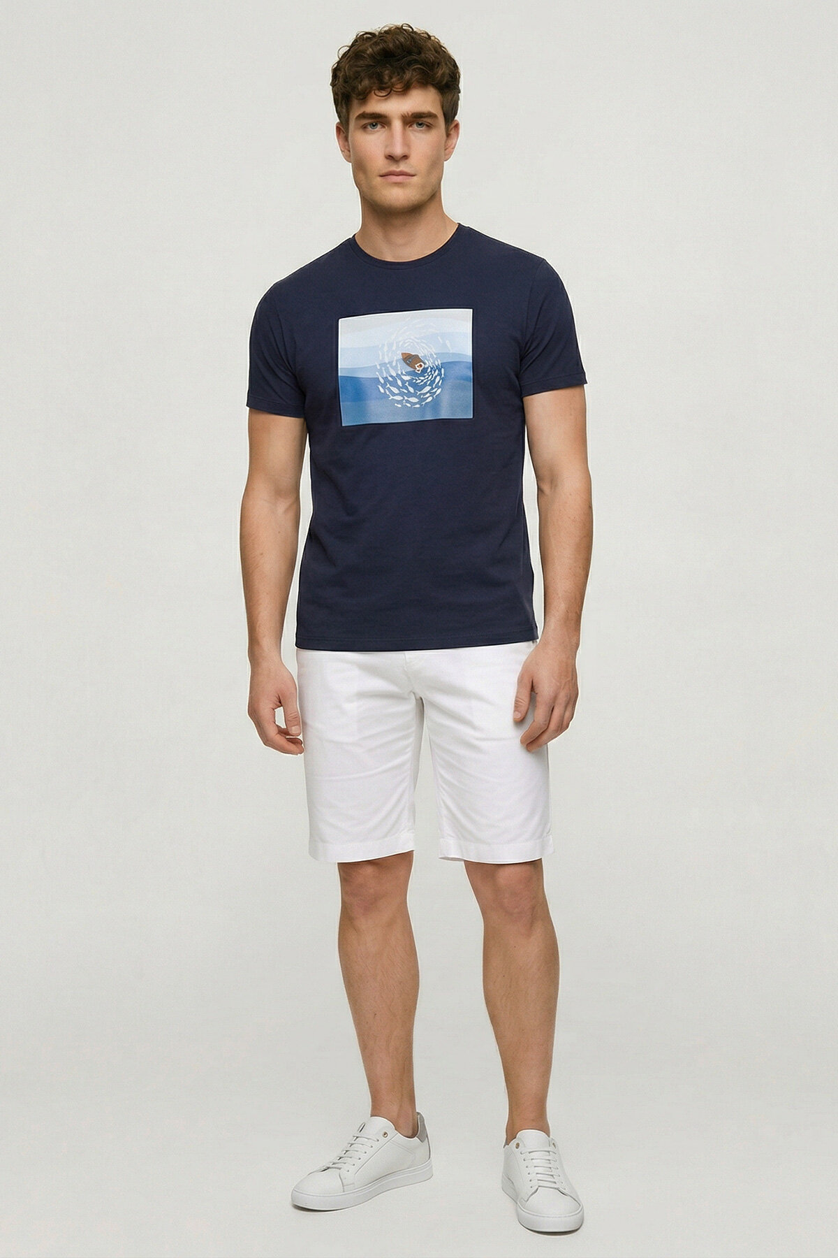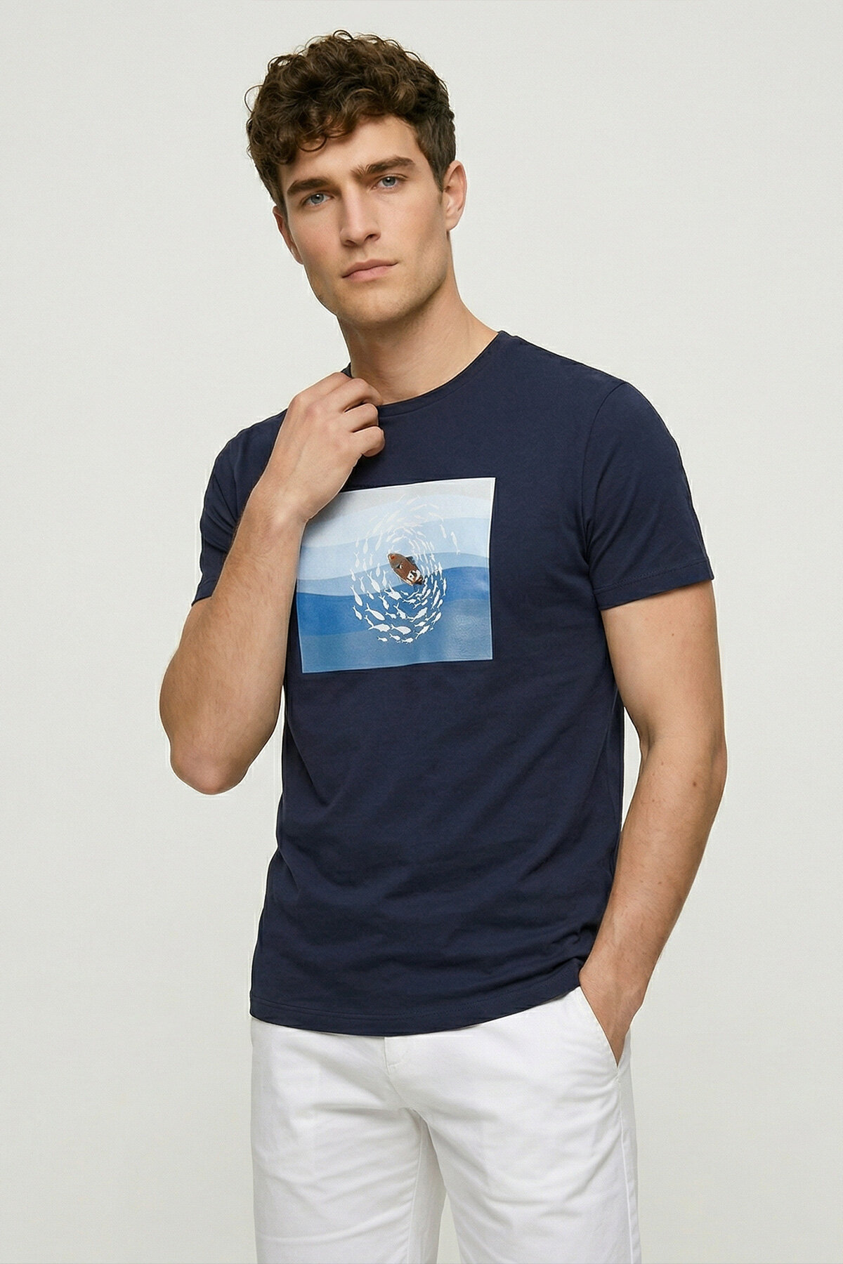 Yazın ferahlığını ve denizin dinginliğini stilinize taşıyın. Derin lacivert zemin üzerine konumlandırılmış sanatsal grafik baskısı ile dikkat çeken bu t-shirt, modern erkeğin günlük şıklığı için tasarlandı. Göğüs kısmındaki dikdörtgen panelde yer alan, mavi ton geçişli deniz illüstrasyonu ve merkezdeki tekne etrafında dönen balık sürüsü detayı, kombininize sofistike bir hikaye katıyor. Nefes alabilen yumuşak pamuklu dokusu, sıcak günlerde maksimum konfor sağlarken, ideal regular fit kalıbı hareket özgürlüğünüzü kısıtlamaz. İster beyaz şortlarla sahil kenarında, ister denim pantolonlarla şehir hayatında kullanabileceğiniz çok yönlü bir parça.