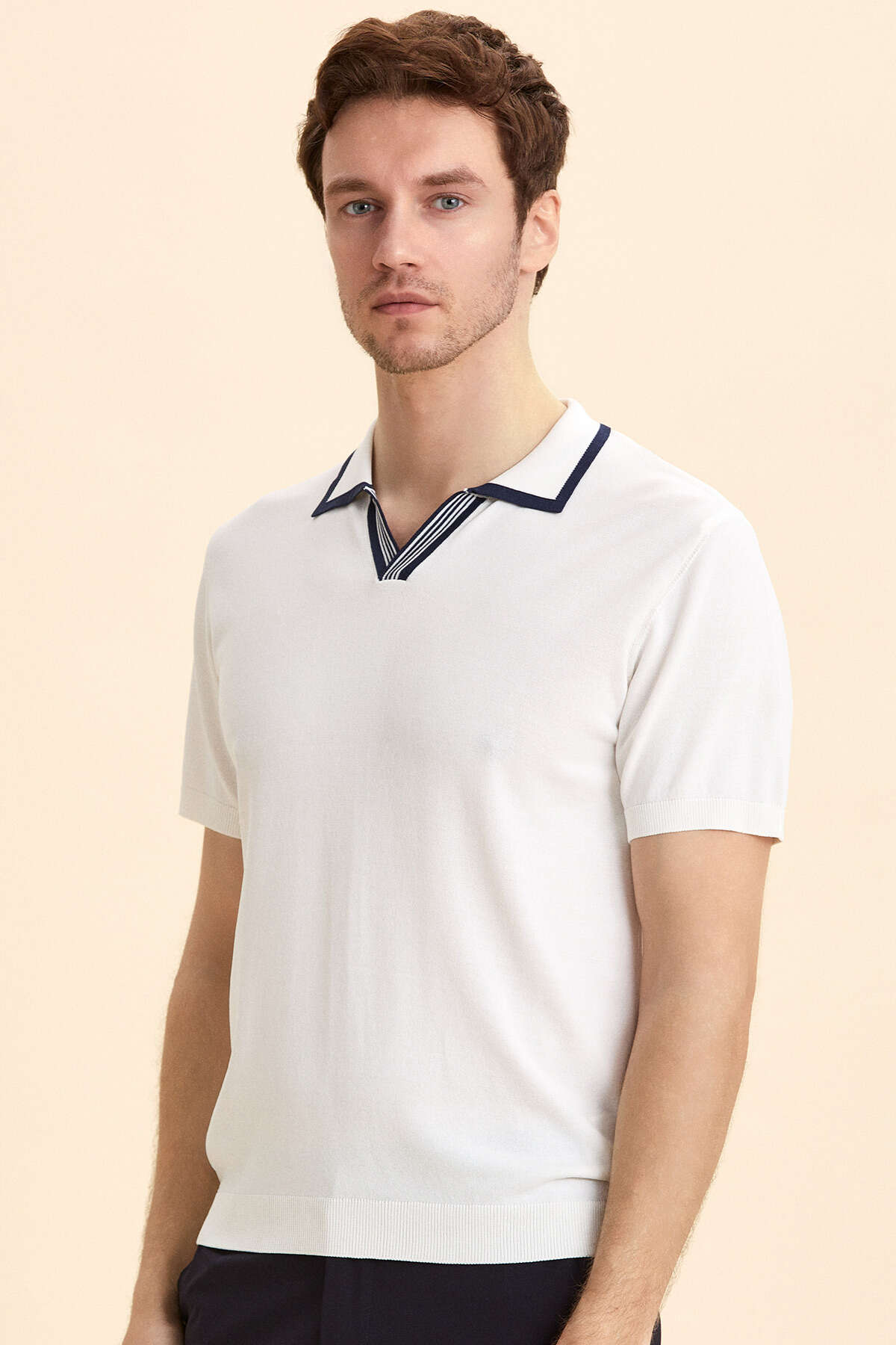 Blending timeless color tones with retro details, this buttonless placket polo neck knitwear will be a style piece that makes a difference in your wardrobe. It adds a modern atmosphere to the classic polo collar with its striped collar detail. It offers maximum comfort in the summer months thanks to its light texture, and gives the body a stylish stance with its cut.